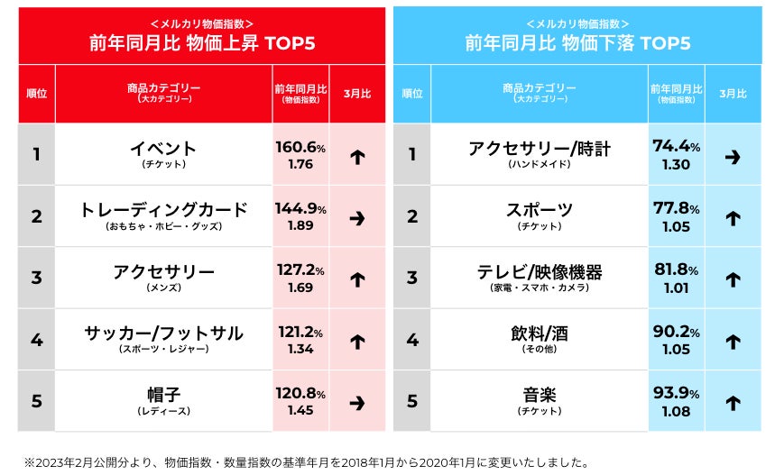 本ニュースレターでは、「メルカリ」の“中カテゴリー”に限定し、前年同月比で物価および数量指数が上昇、または下落した商品カテゴリーを紹介しています。
