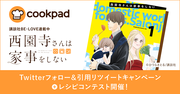 - 料理レシピサービス「クックパッド」は、講談社「BE・LOVE」で連載中の漫画作品『西園寺さんは家事をしない』とコラボしたレシピコンテストおよびTwitterキャンペーンを2022年6月14日(火)から開催する