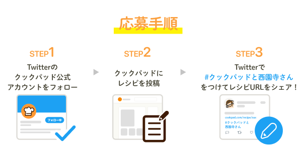 ・応募方法:クックパッド公式Twitterをフォローし、料理レシピサービス「クックパッド」にレシピを投稿する。その後、Twitterで「#クックパッドと西園寺さん」をつけてレシピURLをシェアする