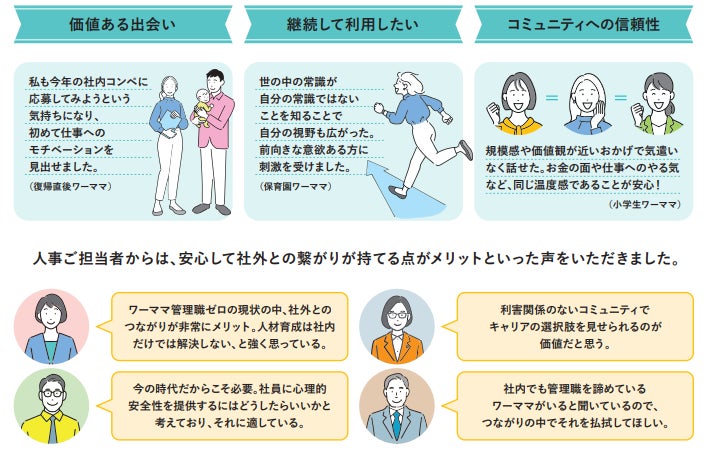 ワーママ同士で、今自分が抱えている悩みを相談することが出来、その会話の中で共感が生まれ、課題に対する姿勢が前向きになると同時に、日々様々な気づきを獲得して視野が広がります。