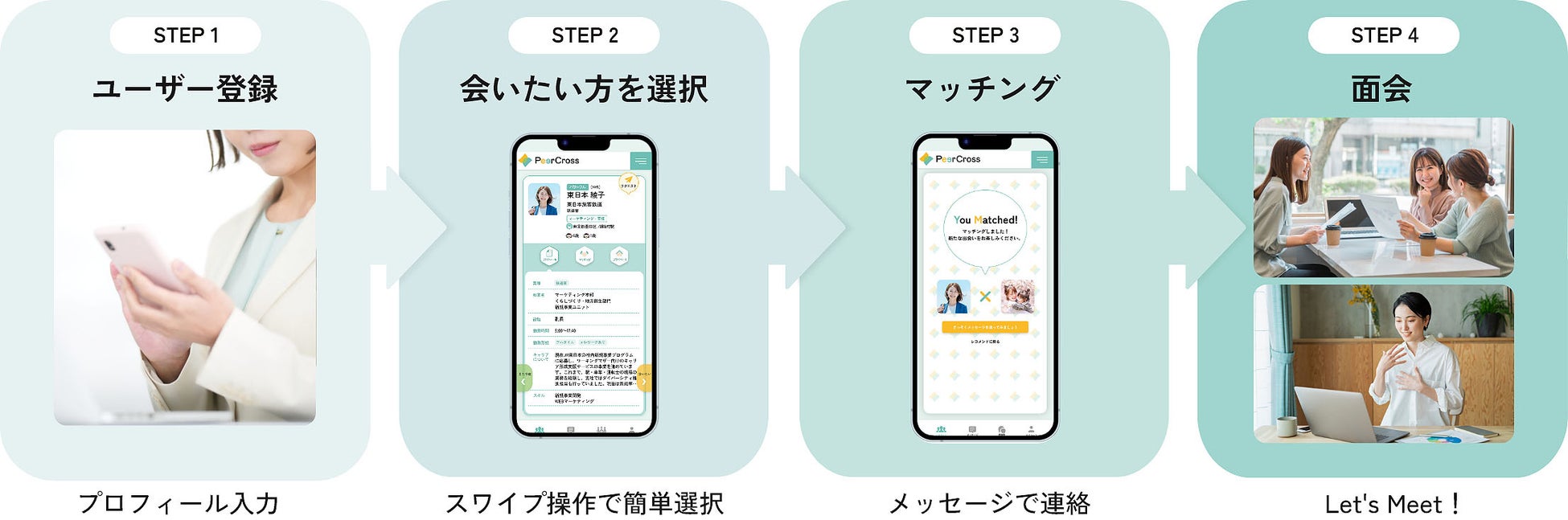 PeerCrossとは大手企業のワーキングマザー同士が、会いたい人を探して、1 on 1で相談ができる キャリア形成支援サービスです。