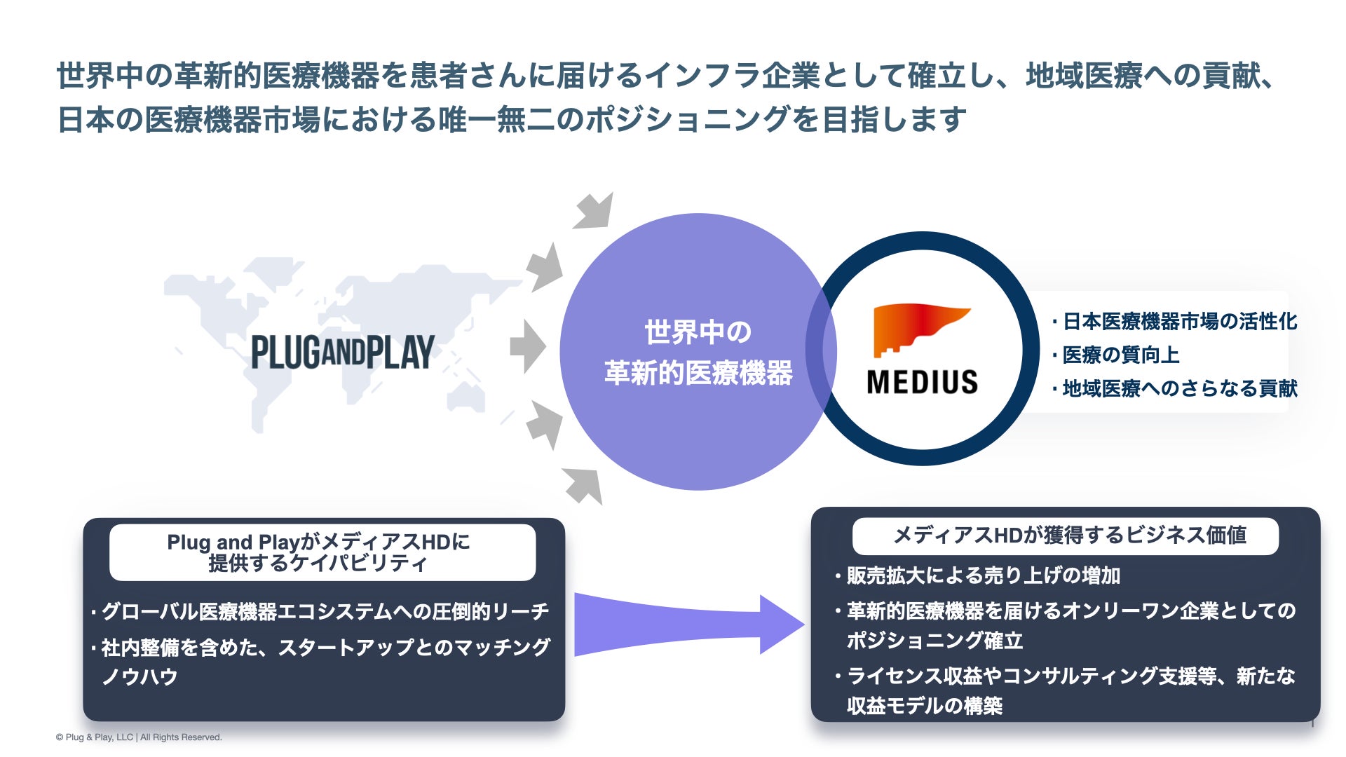 Plug and Play Japan株式会社(本社:東京都渋谷区、代表取締役社長:ヴィンセント・フィリップ、以下「Plug and Play」)は、メディアスホールディングス株式会社(本社:東京都千代田区、代表取締役社長:池谷保彦、以下「メディアスHD」)とヘルスケア分野におけるパートナーシップを締結したことをお知らせいたします。
