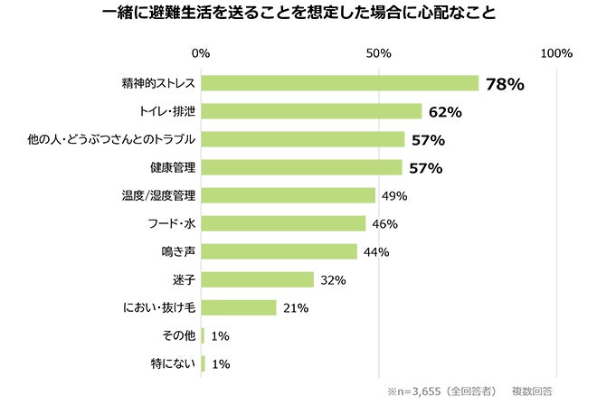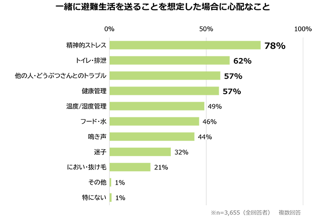 ペットと一緒に避難生活を送ることを想定した場合にペットに関して心配なこと(複数回答)の上位の回答は、下記の通りでした。