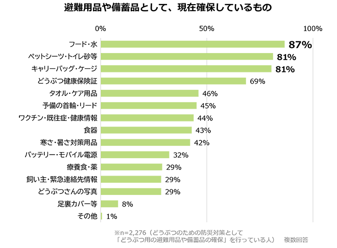 ペットのための対策として最も多かったのは「避難用品や備蓄の確保」でした。確保を行っている人のうち80%以上が「フード・水(87%)」「ペットシーツ・トイレ砂等(81%)」「キャリーバッグ・ケージ(81%)」を確保していると回答しました。