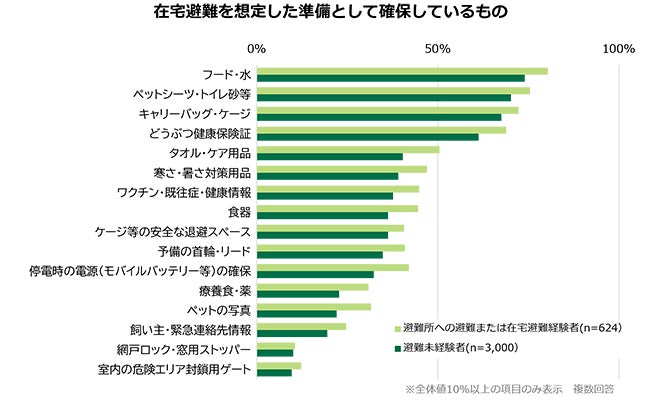 避難経験者は未経験者と比べ、「タオル・ケア用品(避難経験者:51%/避難未経験者:40%)」「停電時の電源(避難経験者:42%/避難未経験者:32%)」「ペットの写真(避難経験者:32%/避難未経験者:22%)」を確保している割合が10ポイント以上高く、実体験が具体的な備えへとつながっていることが分かります。