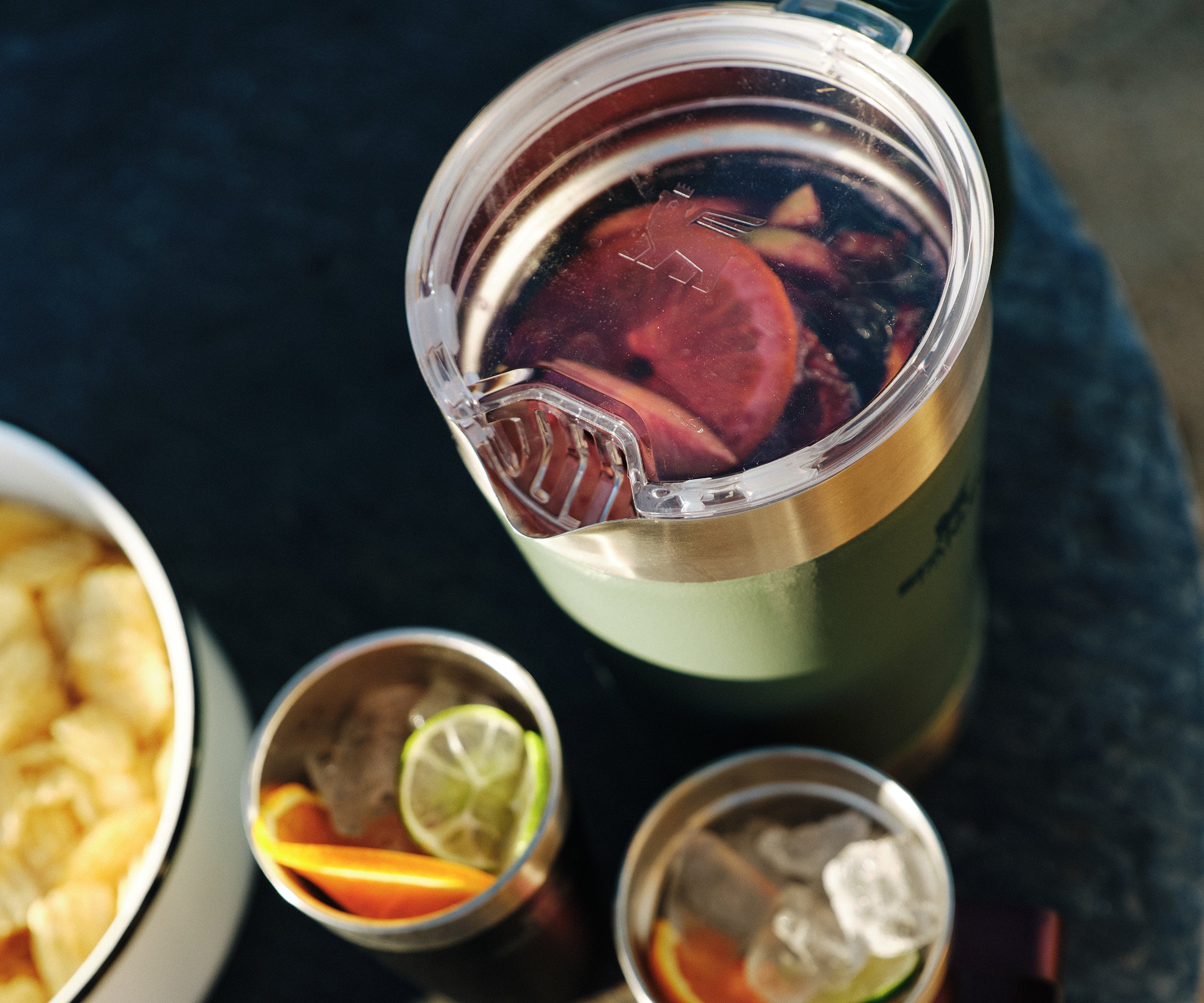 1.89リットルの大容量で、クリアな上蓋によって中の容量もひと目でわかり、氷なども干渉せずスムーズに注ぐことが可能。ジュースやティー、炭酸からアルコールまで幅広いドリンクに対応し、様々なシーンで快適なドリンクタイムを楽しんでいただけます。