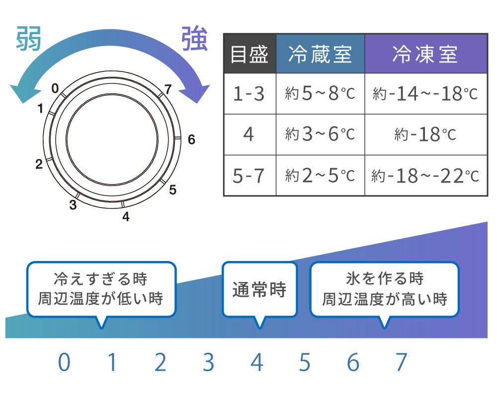 温度調整は、誰でも簡単に操作できるダイヤル式を採用しました。ダイヤルには7段階の目盛があり、周囲の温度が低いとき、冷蔵庫の中のものが冷えすぎているとき、氷を作るとき等、庫内全体の温度を状況に合わせて設定することができます。