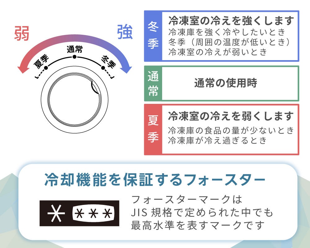 冷凍室と冷蔵室の冷気は、冬季・通常・夏季の季節に合わせた3段階に調節することができます。また、冷却機能は、JIS規格の中でも最高水準であるフォースターが付与されています。