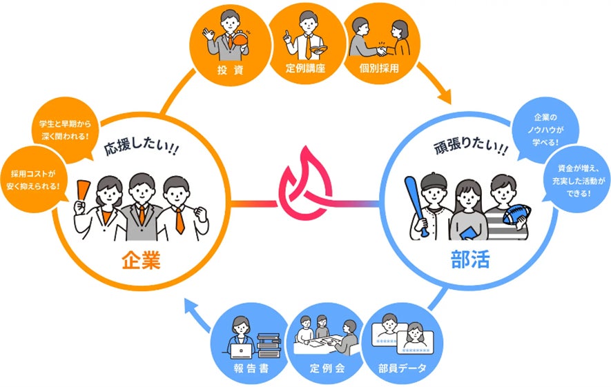SPONSORS BOOST は、企業が大学部活に小口スポンサーとして出資することで、学生との深いつながりを実現する革新的なプラットフォームです。このプラットフォームを通じて、企業は部活動費を支援することで、学生の部活動をサポートします。学生においては、部費運営に頭を悩ませることなく部活に集中できるだけでなく、企業との接点により「働く」ことへの学びを深めることができ主体的なキャリア構築を行うことができます。また、企業にとっても優秀な学生との直接接点を持つことで、採用費を抑え、将来的な採用において優位に立つことができます。