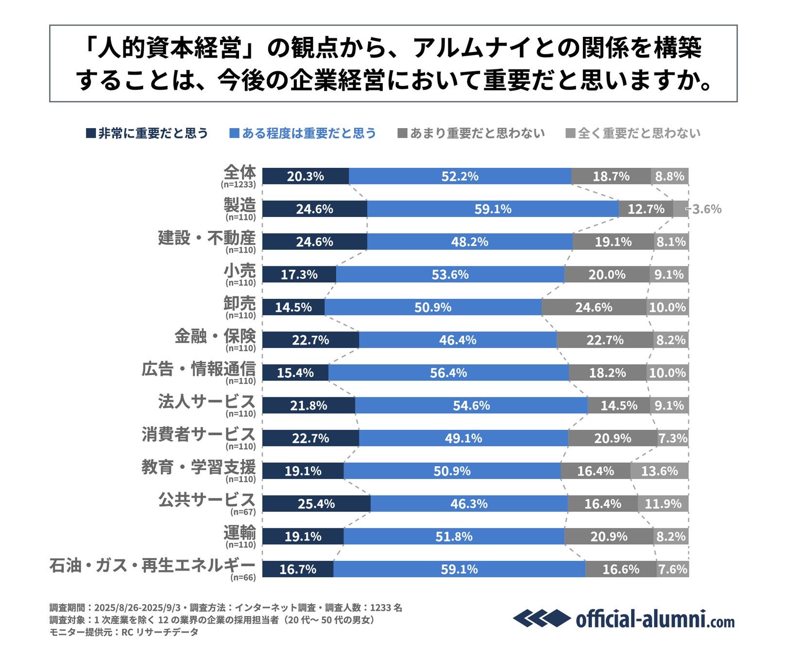 また、「『人的資本経営』の観点から、アルムナイとの関係を構築することは、今後の企業経営において重要だと思うか」を尋ねる設問への回答では、12業界の平均は、1位が「ある程度は重要だと思う」で52.2%、2位が「非常に重要だと思う」で20.3%、3位が「あまり重要だと思わない」で18.7%という結果になりました。