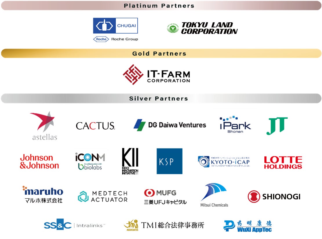 <シルバーパートナー>アステラス製薬株式会社、カクタス・コミュニケーションズ株式会社、株式会社DG Daiwa Ventures、アイパークインスティテュート株式会社、日本たばこ産業株式会社医薬総合研究所、Johnson and Johnson、公益財団法人川崎市産業振興財団、株式会社慶應イノベーション・イニシアティブ、株式会社ケイエスピー、京都大学イノベーションキャピタル株式会社、株式会社ロッテホールディングス、マルホ株式会社、MedTech Actuator、三菱UFJキャピタル株式会社、三井化学株式会社、塩野義製薬株式会社、イントラリンクス合同会社、TMI総合法律事務所、株式会社WuXi AppTec Japan