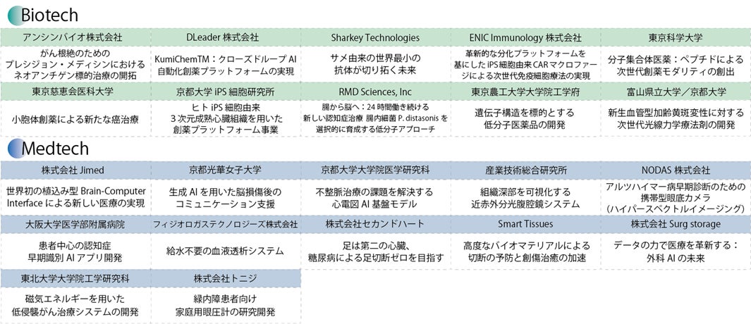 本年も多数の応募があり、22社のスタートアップ(起業前の研究者含む)が選考を通過し採択されました。Demo Dayではさらに審査を勝ち抜いた15社程度がピッチ予定です。「Biotech部門」は主に創薬・バイオ・再生医療などの事業を対象とし、「Medtech部門」は主にデジタルヘルス・医療機器などの事業を対象とします。