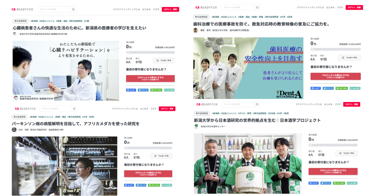 READYFORが業務提携を結んだ大学は、新潟大学で41校目となります。今回新たに開始した「新潟大学 ×READYFOR」では、以下4件のプロジェクトを公開いたします。