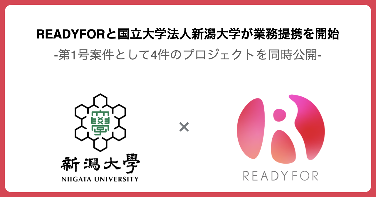 日本初・国内最大級のクラウドファンディングサービス「READYFOR」を運営するREADYFOR株式会社(代表取締役CEO:米良はるか、本社:東京都千代田区)と国立大学法人新潟大学(学長:牛木辰男、所在地:新潟県新潟市)は、研究費用等獲得を目的としたクラウドファンディング活用に関する業務提携を締結しました。また本日 、締結後初となるクラウドファンディングプロジェクトを4件同時公開いたしました。