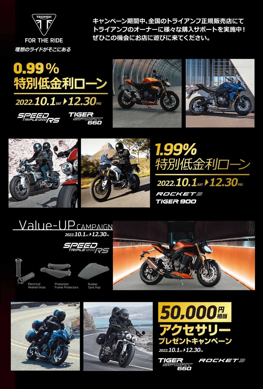 内容:キャンペーン期間中、全国のトライアンフ正規販売店にて対象車両をご成約、且つローン契約完了していただいたお客様に、「0.99% 特別低金利ローン」をご提供いたします。