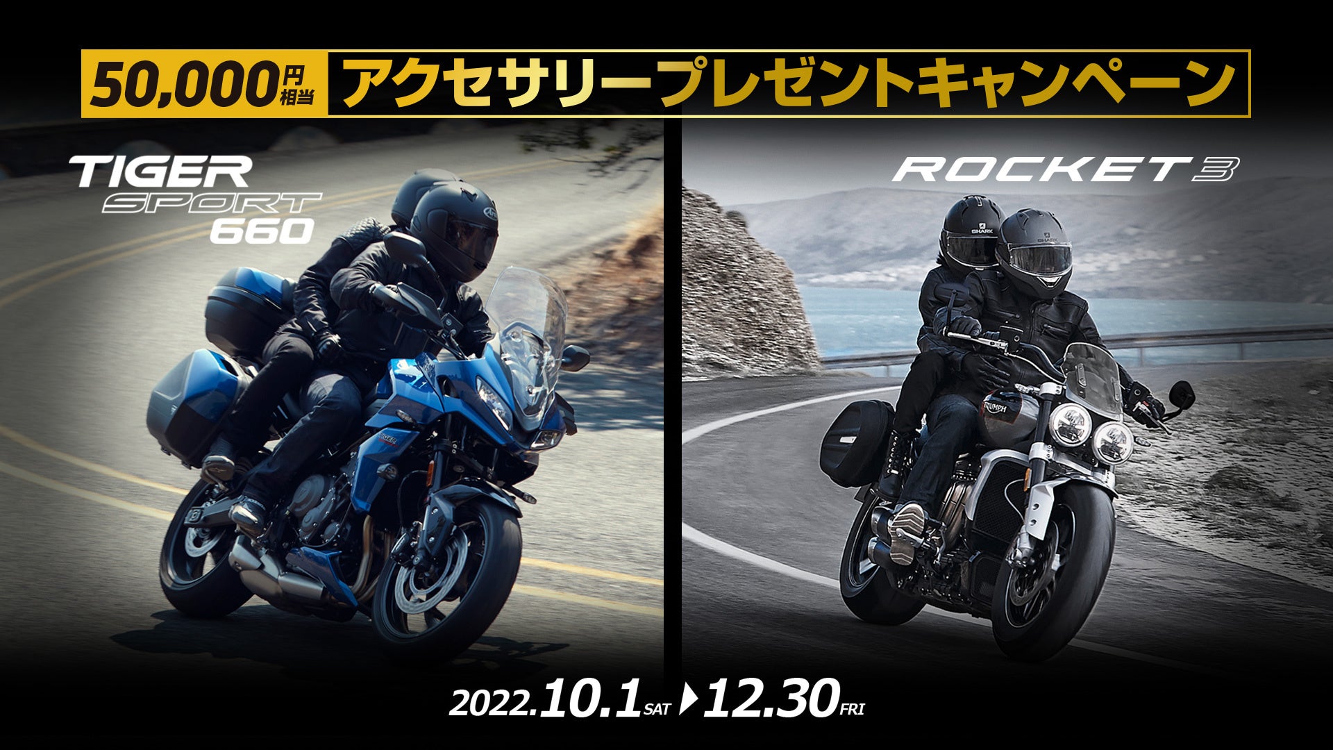 内容:キャンペーン期間中、全国のトライアンフ正規販売店にて対象車両をご成約、且つご登録されたお客様に「5万円分のアクセサリーをプレゼント」いたします。