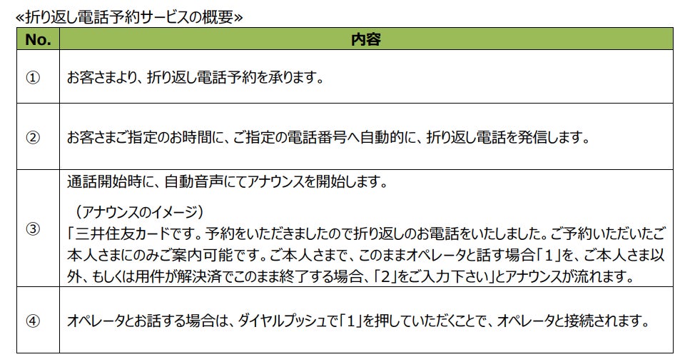 三井住友カード株式会社(本社:東京都江東区、代表取締役社長:大西 幸彦、以下:三井住友カード)は、お客さまとコールセンターの更なる円滑なコミュニケーション実現のため、2022年11月より、自動折り返し電話予約を開始しますので、お知らせいたします。なお、お客さまの電話機操作による折り返し電話予約から、折り返し架電までの一連の業務を自動で行うサービスの実装は、国内初の取り組みとなります。