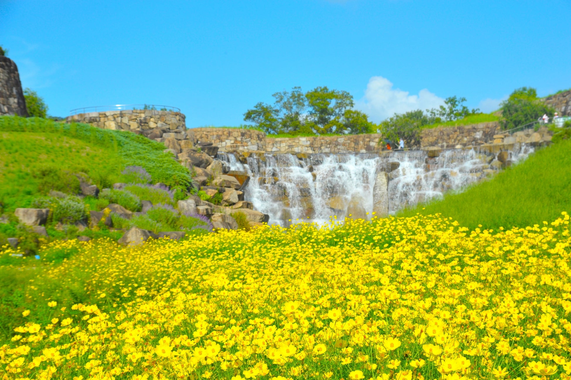 国営讃岐まんのう公園内の青竜の谷にて「キバナコスモス“レモンブライト”」が見頃を迎えています。