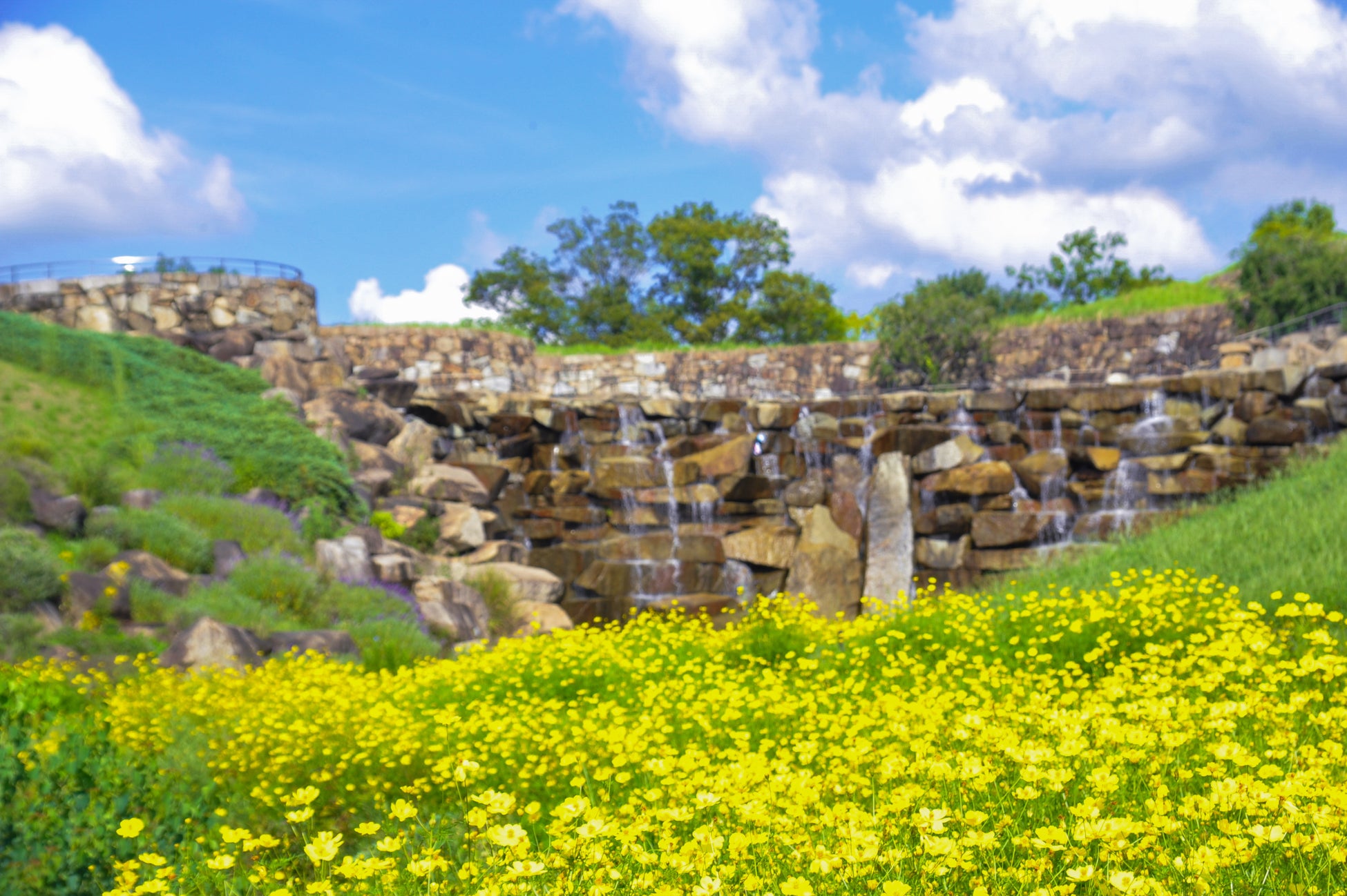 まんのう公園では香川特産の庵治石(※1)を使った迫力のある「昇竜の滝」を背景に、谷間を埋め尽くすように咲く様子をお楽しみいただけます。