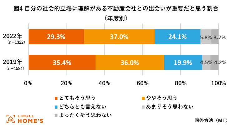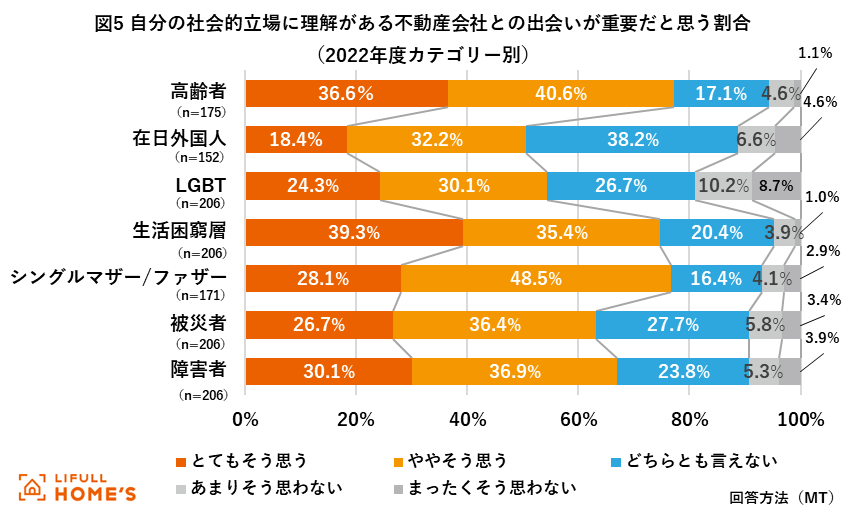 賃貸住宅探しをする際に「自分の社会的立場に理解のある不動産会社との出会いが重要だと思う」と尋ねたところ、住宅弱者全体の66.3%が「そう思う(とてもそう思う+ややそう思う)」と回答しました。2019年の調査より約5ptのマイナスの結果となりましたが、引き続き高い割合で求められていることが分かります【図4】。特に、高齢者(77.2 %)、シングルマザー・ファザー(76.6 %)、生活困窮層(74.7%)で70%を超え、障害者(67.0%)も住宅弱者全体の平均を上回る結果になりました【図5】。