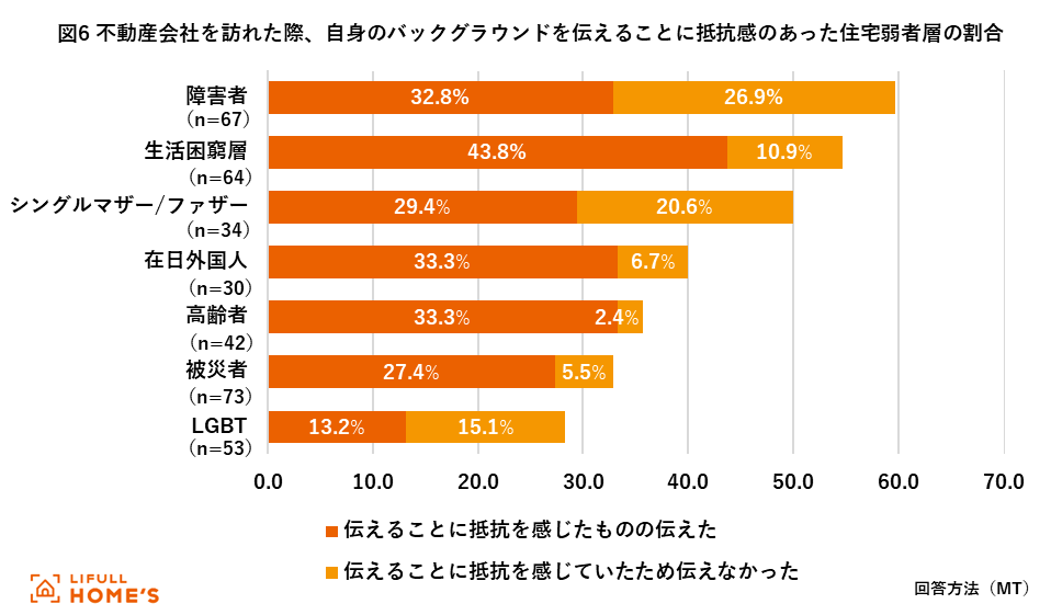 不動産会社を訪れた際、約6割の障害者が自身のバックグラウンドを伝えることに抵抗感があったと回答し、全ての住宅弱者カテゴリーで最も多い結果に。