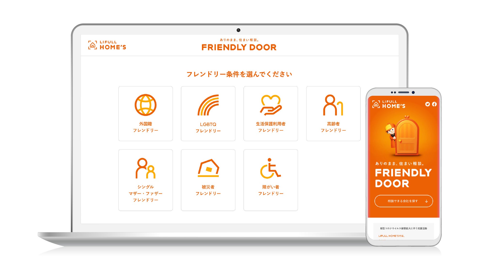 事業を通して社会課題解決に取り組む株式会社LIFULL(ライフル)(以下、LIFULL、本社:東京都千代田区、代表取締役社長:井上高志、東証プライム:2120)が運営する不動産・住宅情報サイト「LIFULL HOME'S」は、高齢者、外国籍、LGBTQ、生活保護利用者、シングルマザー・ファザー、被災者、障害者といった『住宅弱者』と呼ばれる方々に対して理解があり、相談に応じてくれる不動産会社を検索することができる「FRIENDLY DOOR」プロジェクトを運営しています。