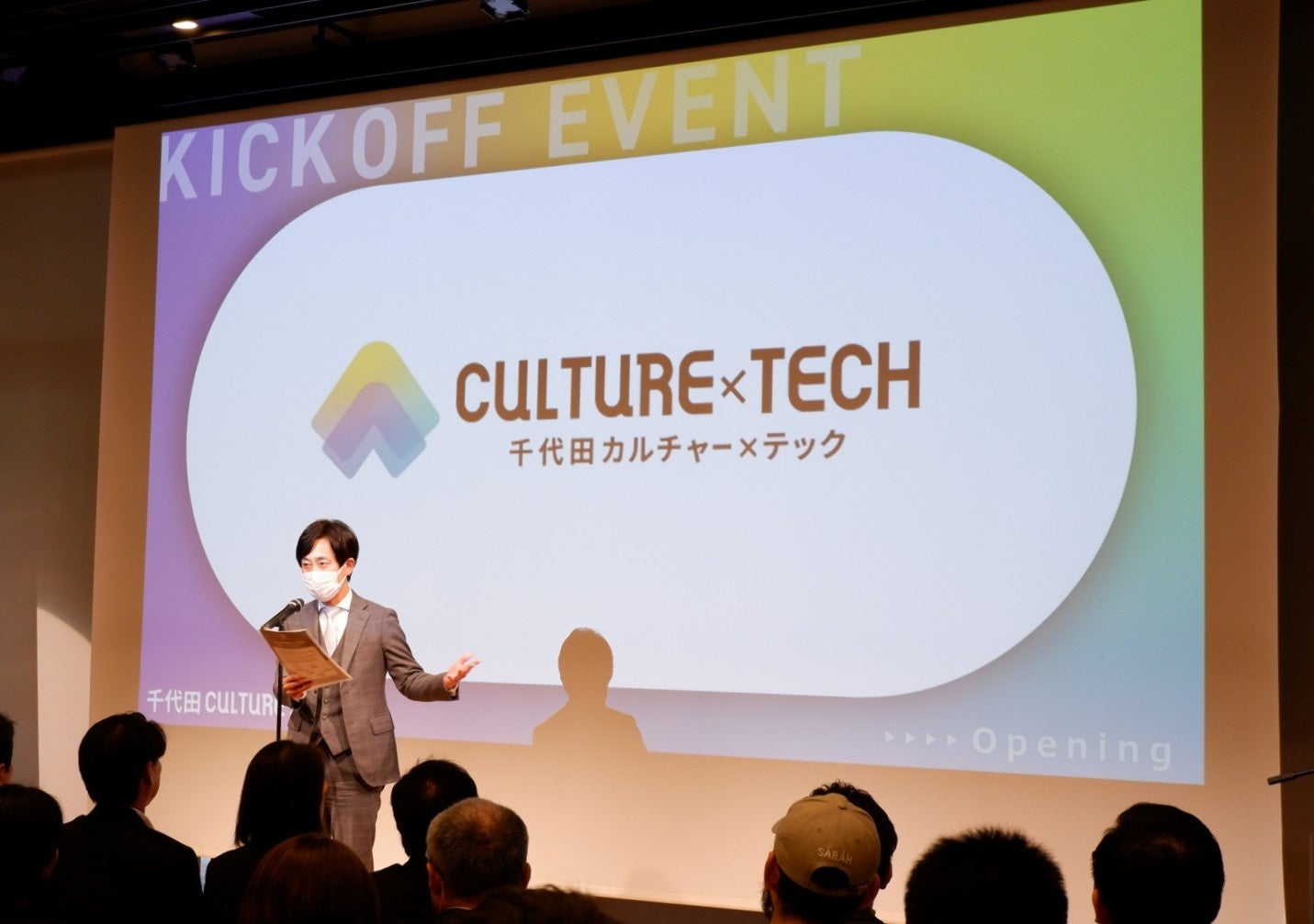 イベント冒頭には、千代田区長の樋口高顕氏が開会の挨拶を行い、千代田区の歴史や、文化や産業が発展してきたこれまでの歩みに触れ、千代田CULTURE×TECHに込めた想いなどをお話しいただいたほか、千代田区の担当者による事業の説明と運営事務局(ツクリエ)による今後のイベント・取り組みに関するご案内を行いました。