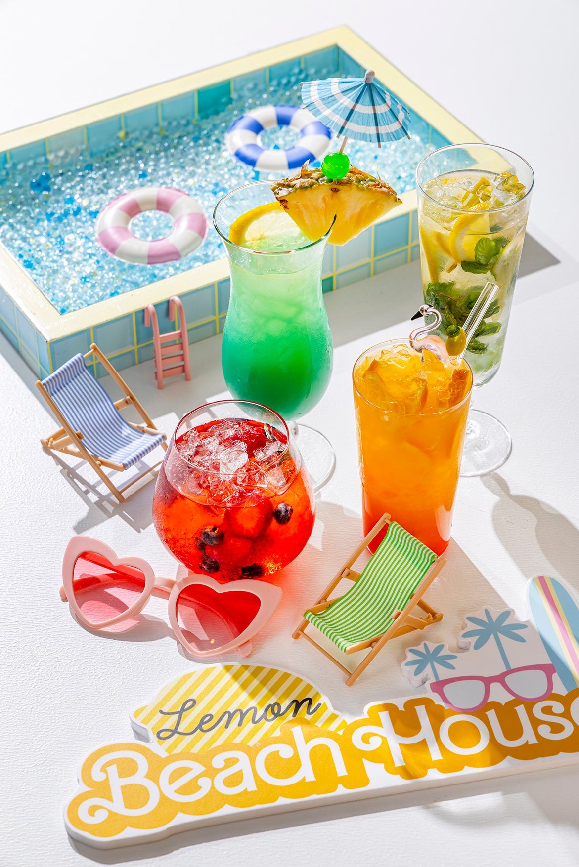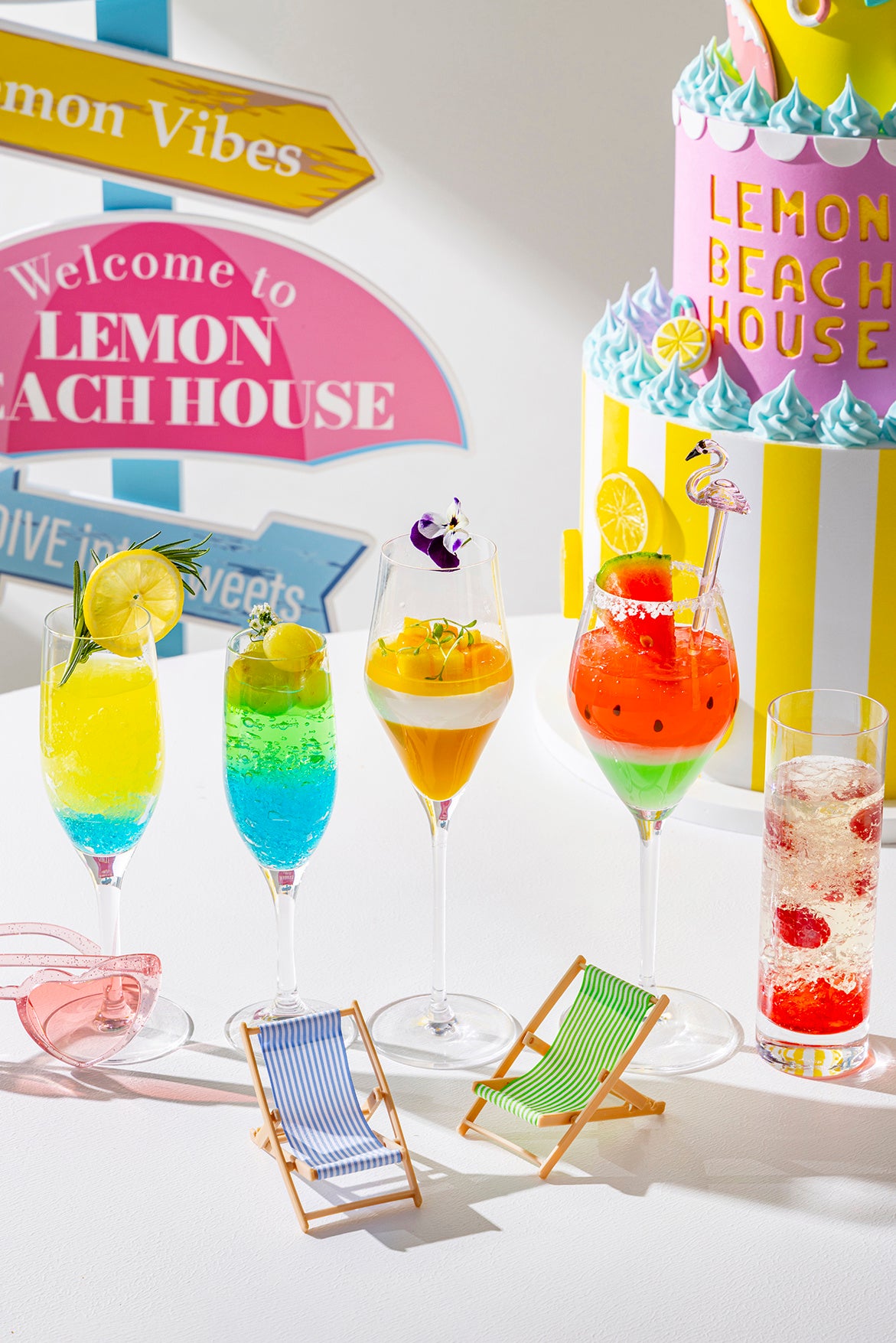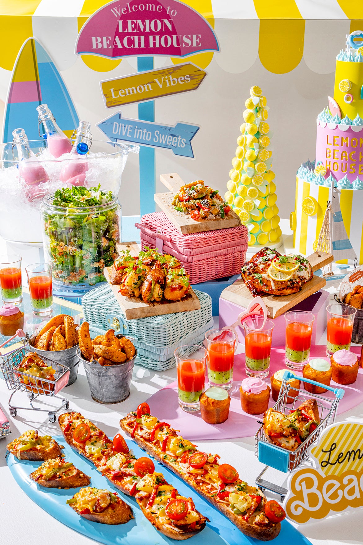 レモンやメロン、マスカットなどのフルーツを贅沢に使用したビーチハウス着想スイーツ20種類に加え、アイスクリーム、シャーベットやソフトクリームなどのひんやりスイーツも豊富にラインアップ。見た目の可愛らしさと、ひと口ごとに広がる爽やかな味わいが、夏のひと時をクールに彩ります。軽食には「スイカとトマトのスムージー」や「ギリシャ風レモンローストチキン」など全8種類をご用意。さらに“ティキバー”コーナーではカラフルな4種のノンアルコールカクテルも登場。まるでビーチハウスで寛ぐように、この夏レモンイエローに包まれながら、ひんやり爽やかなスイーツを心ゆくまで楽しむ、とびきりハッピーなひとときをお過ごしください。