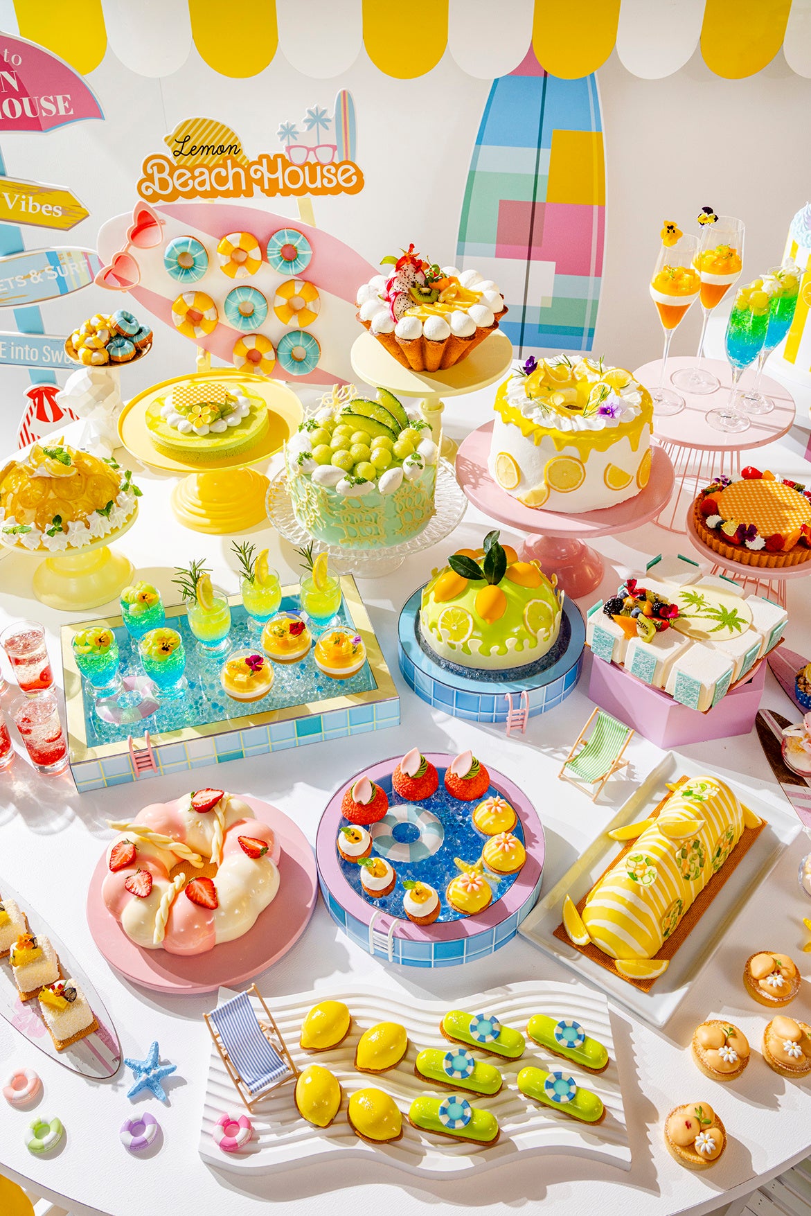 ビタミンたっぷりのレモンをはじめ、メロンやマンゴー、マスカットなどのフルーツをふんだんに使用したスイーツは、ビーチに欠かせないパラソルや浮き輪、サーフボードをモチーフにした心弾むラインアップ。20種類のスイーツは、華やかなホールサイズでご用意するプレゼンテーションケーキに加え、お皿に美しく盛り付けられるスモールポーションでもご提供します。お好きなスイーツを少しずつ、気分のままに組み合わせながら、自分だけの“夏の一皿”をお楽しみいただけます。