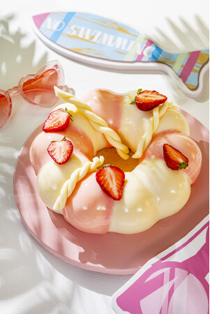 はちみつとローズマリー香るシフォンケーキをシャンティでコーティングし、キャンディレモンを冠した「レモン・スクイージー」は、フレッシュレモンとローズマリーの香りがお口いっぱいに広がる爽やかな一品です。軽やかなバニラスポンジに瑞々しいメロンを重ね、ラベンダーの香りをうつしたバニラシャンティとフレッシュメロンで仕上げた「エメラルド・ラグーン」、ピスタチオのダックワーズとレモンゼリーのレイヤーの上にリッチなバニラクレモーを重ねたドーム型ケーキ「シトラスパラソル」、カモミールが上品に香るピーチムースの中に甘酸っぱいストロベリーコンポートを配し、まるで浮き輪のようなフォルムの「ファンシーフロートリング」など、エグゼクティブペストリーシェフ ラティーシュ・ナイヤー(Ratheesh Nair)の遊び心が光る新作スイーツが揃います。