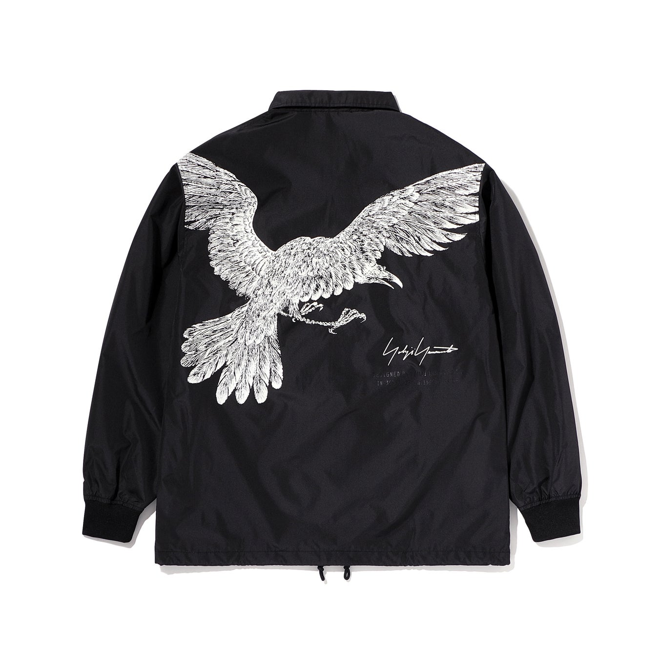 ポリエステル100%の生地を採用し、ゆったりとしたシルエットに仕上げた[Coach Jacket]。背面にアーカイブモチーフ「カラス」のアートワークと「ヨウジヤマモト」のシグネチャーロゴをレイアウト。