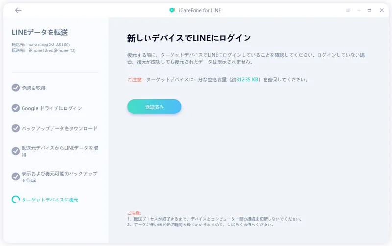 Step4: バックアップの完了後、移行先のiPhoneでLINEアプリにログインすると、iPhoneにデータが転送されます。