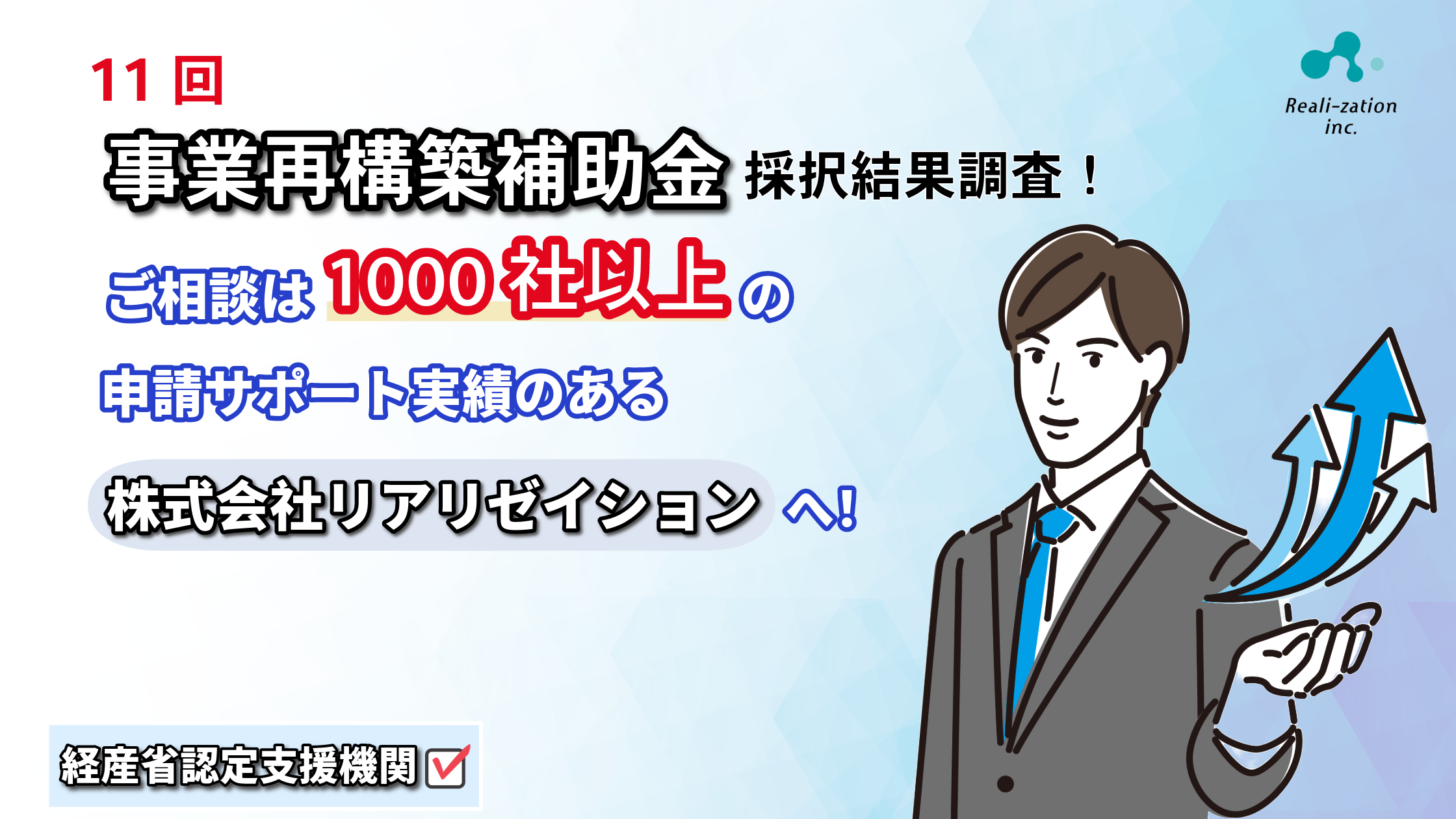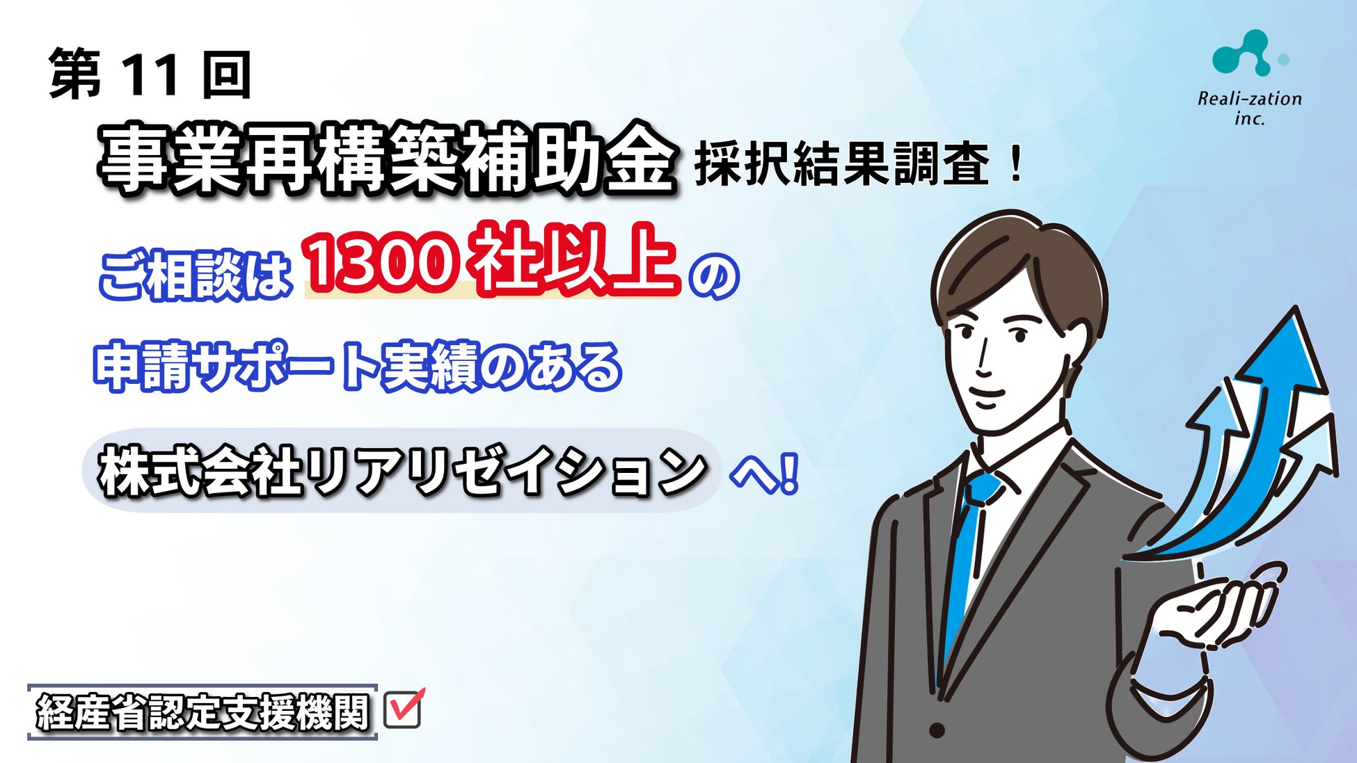「世界一優しい行政手続きに」をキャッチコピーとする、株式会社リアリゼイション(本社:東京都渋谷区)は、「事業再構築補助金」の歴代採択率および、第11回の採択率を調査、発表しました。