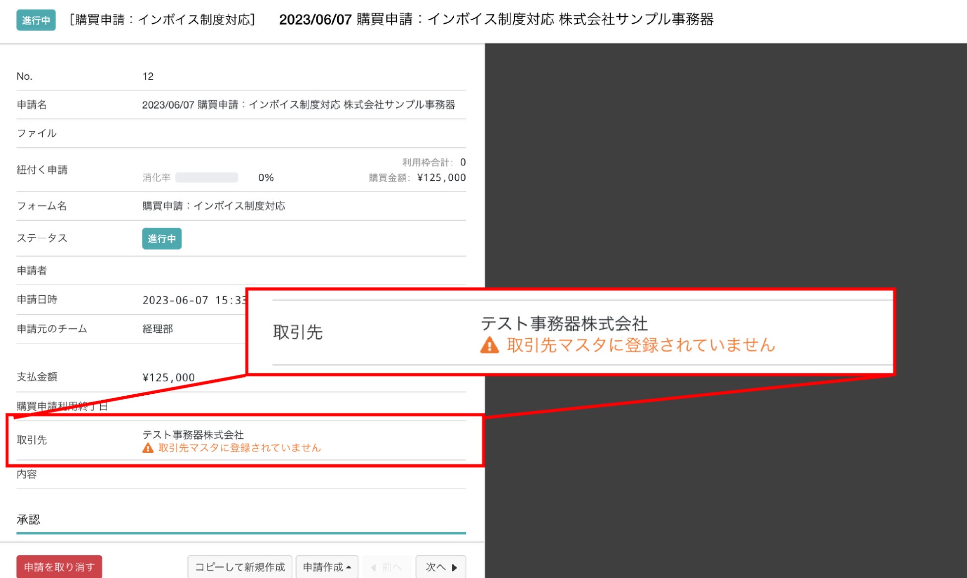 ▼適格請求書発行事業者番号の情報がバクラクの取引先マスタに登録されていない場合:申請者・承認者共通表示