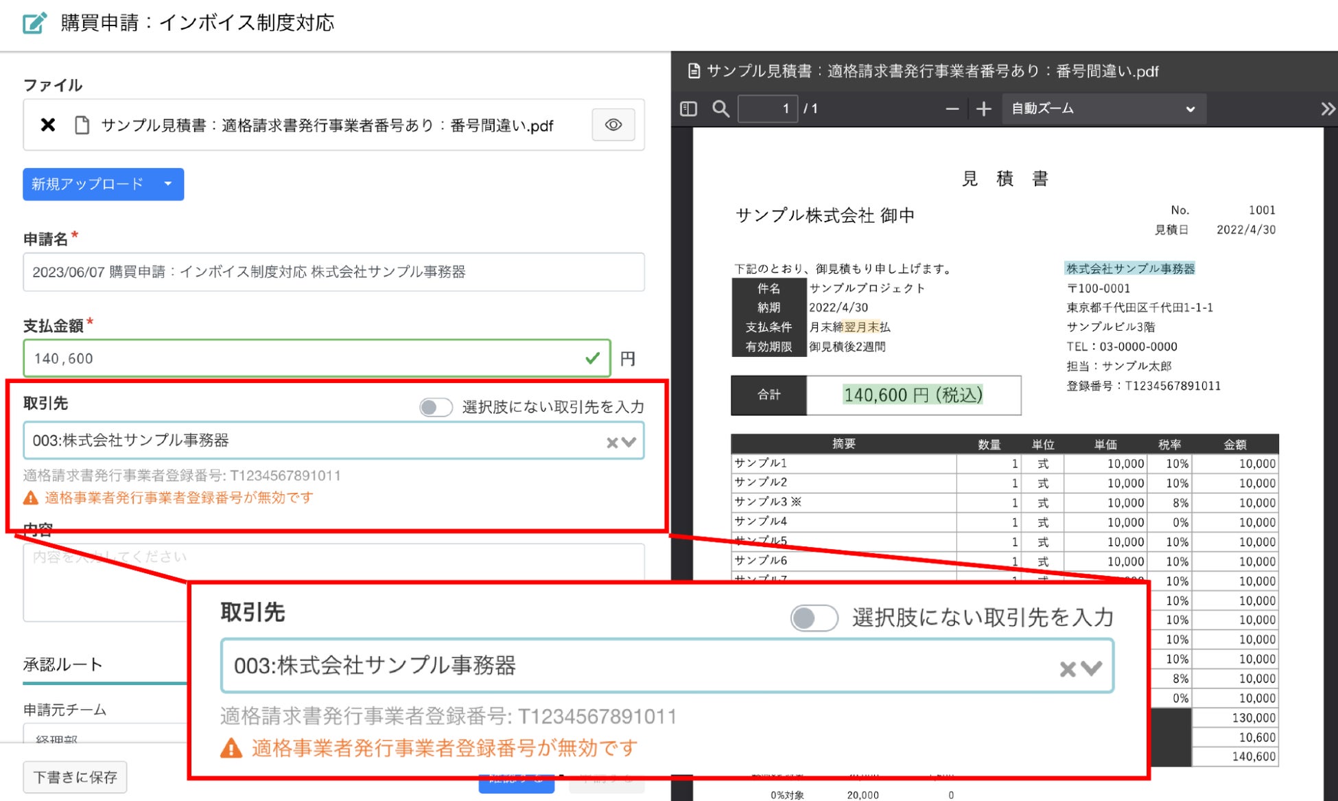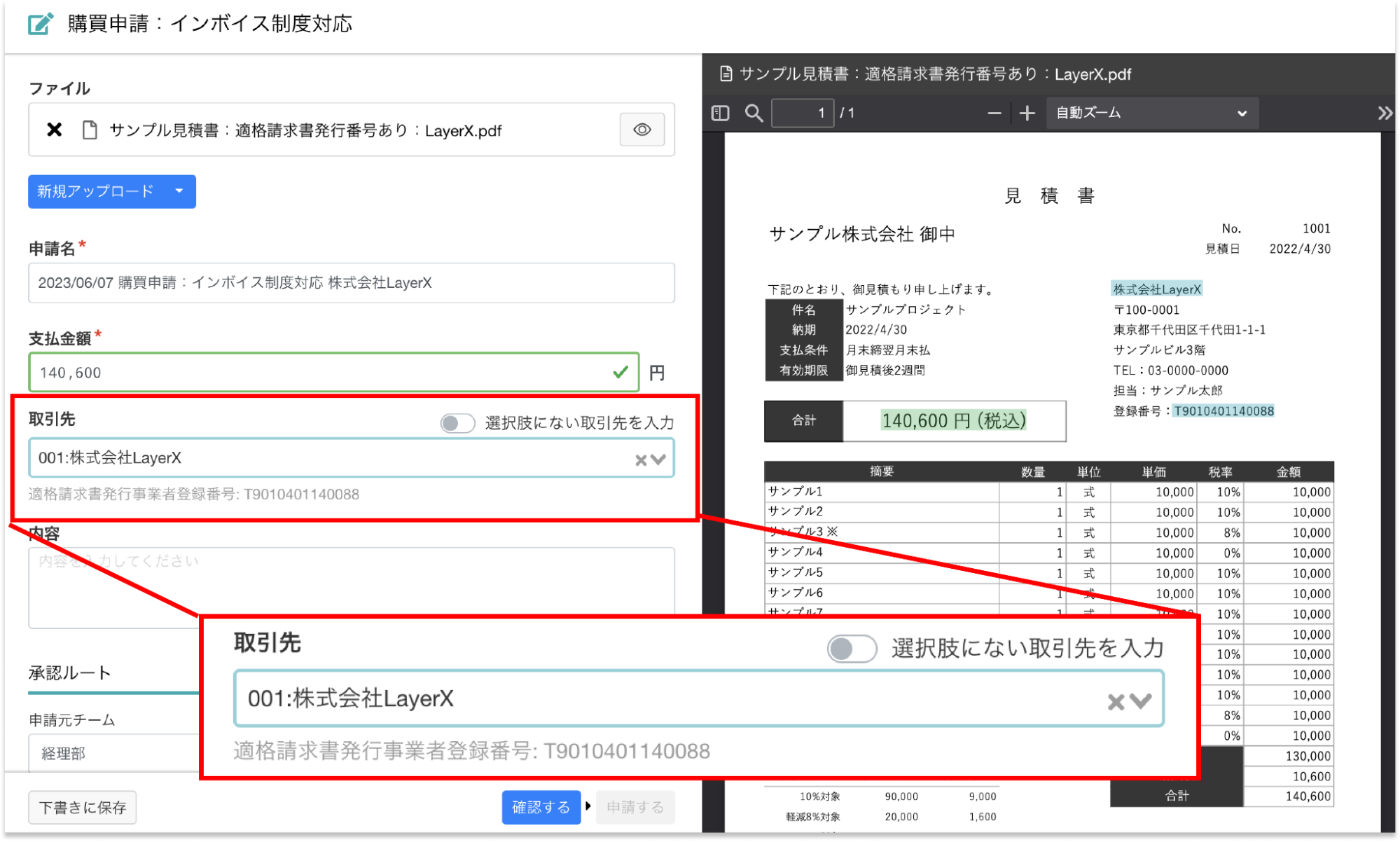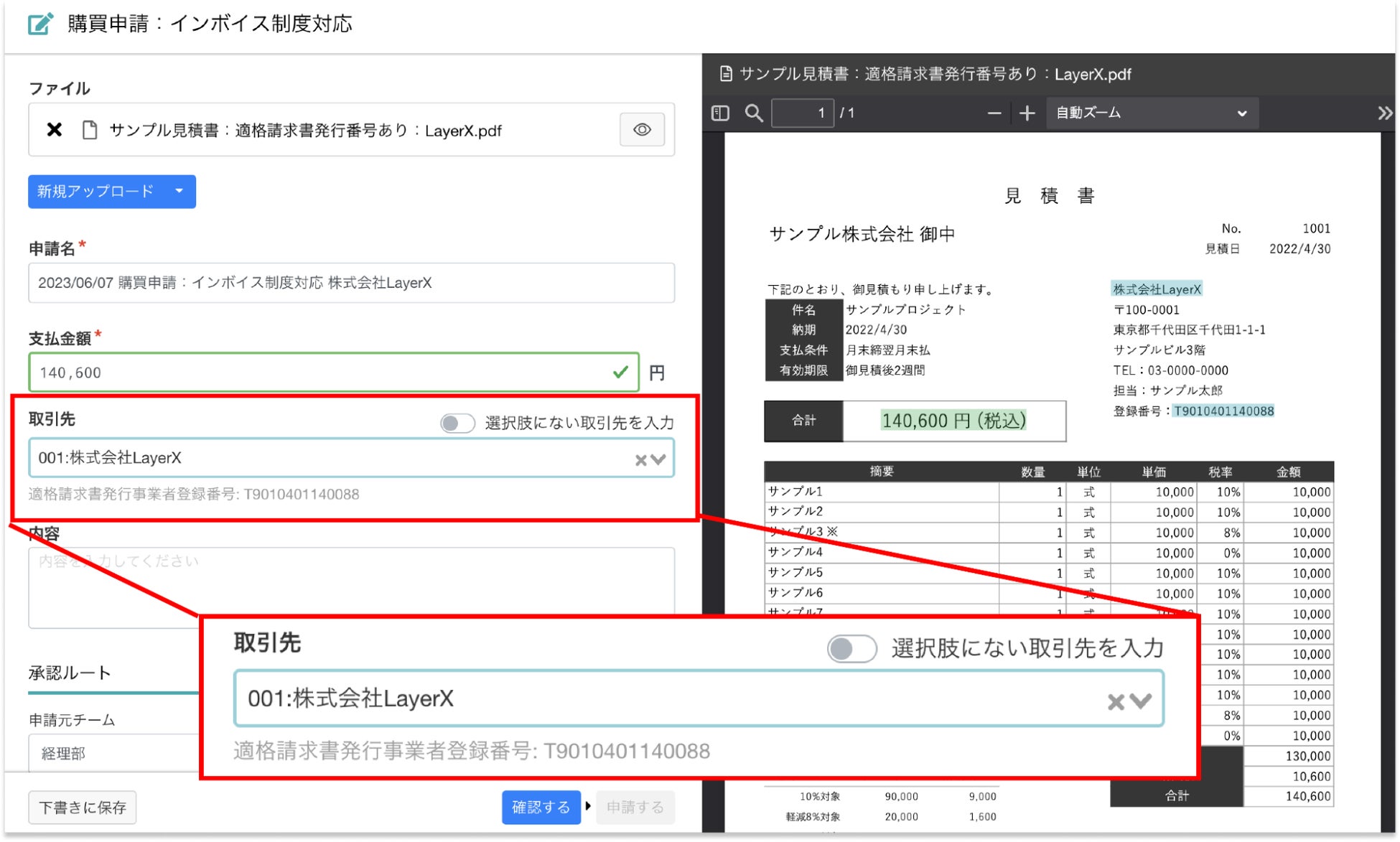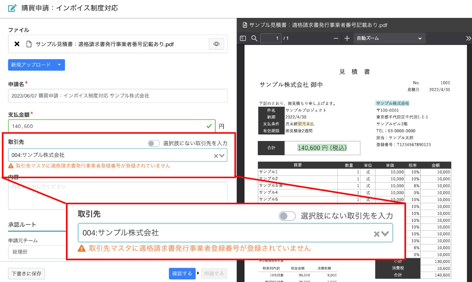 申請者が購買申請に添付した見積書などの書類からAI-OCRが取引先名を自動で読み取り、取引先マスタ上の登録状況・適格請求書発行事業者としての登録状況を自動で判定、結果に応じてアラート文言を申請者に表示します。