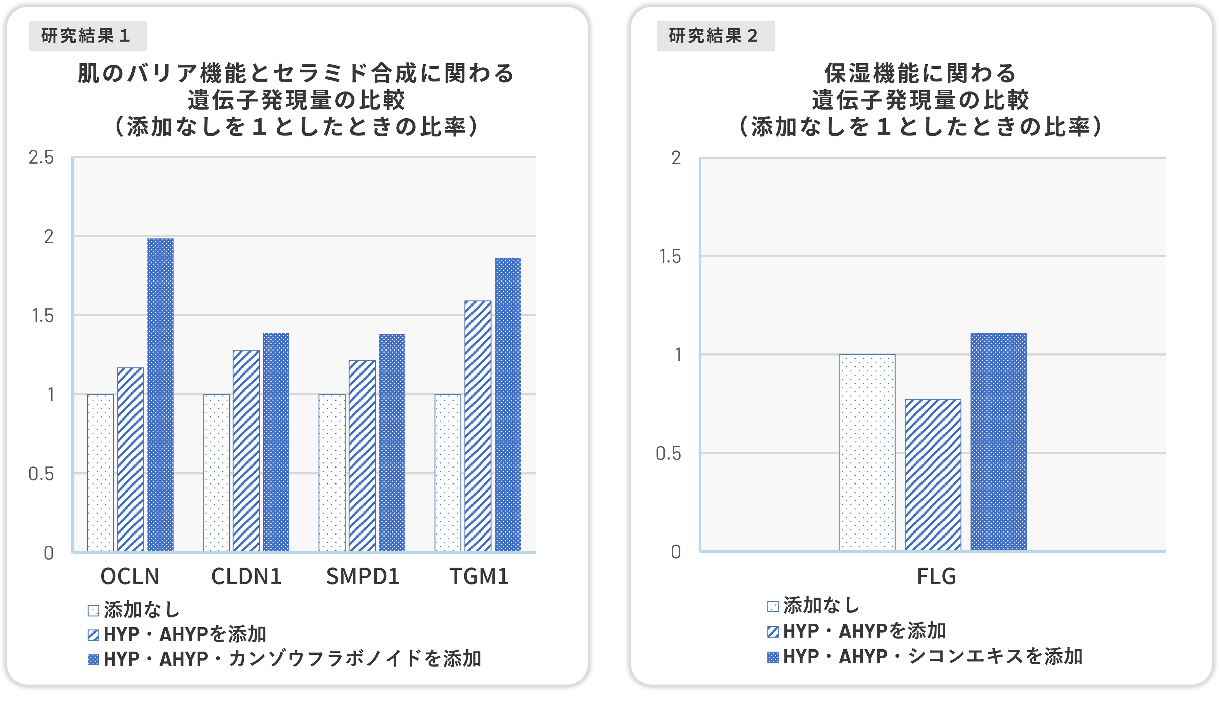 正常ヒト表皮角化細胞に、コラーゲン特有のアミノ酸である「ヒドロキシプロリン(HYP)」「アセチルヒドロキシプロリン(AHYP)」と、薬用植物カンゾウの根から抽出した成分「カンゾウフラボノイド」、薬用植物ムラサキの根から抽出した「シコンエキス」を添加し、肌のバリア機能及び保湿機能に関する遺伝子発現を検証した結果、上記の効果を確認しました。