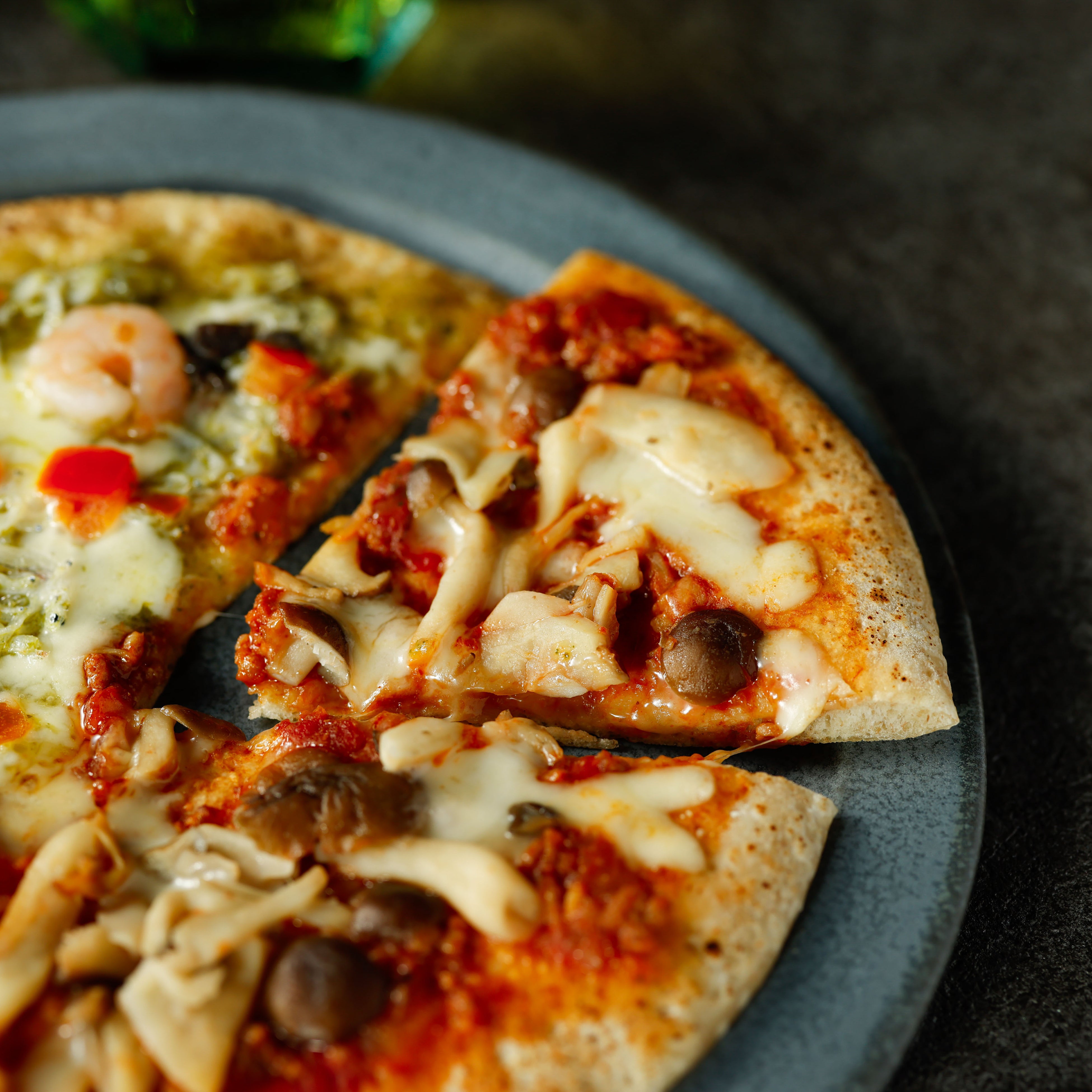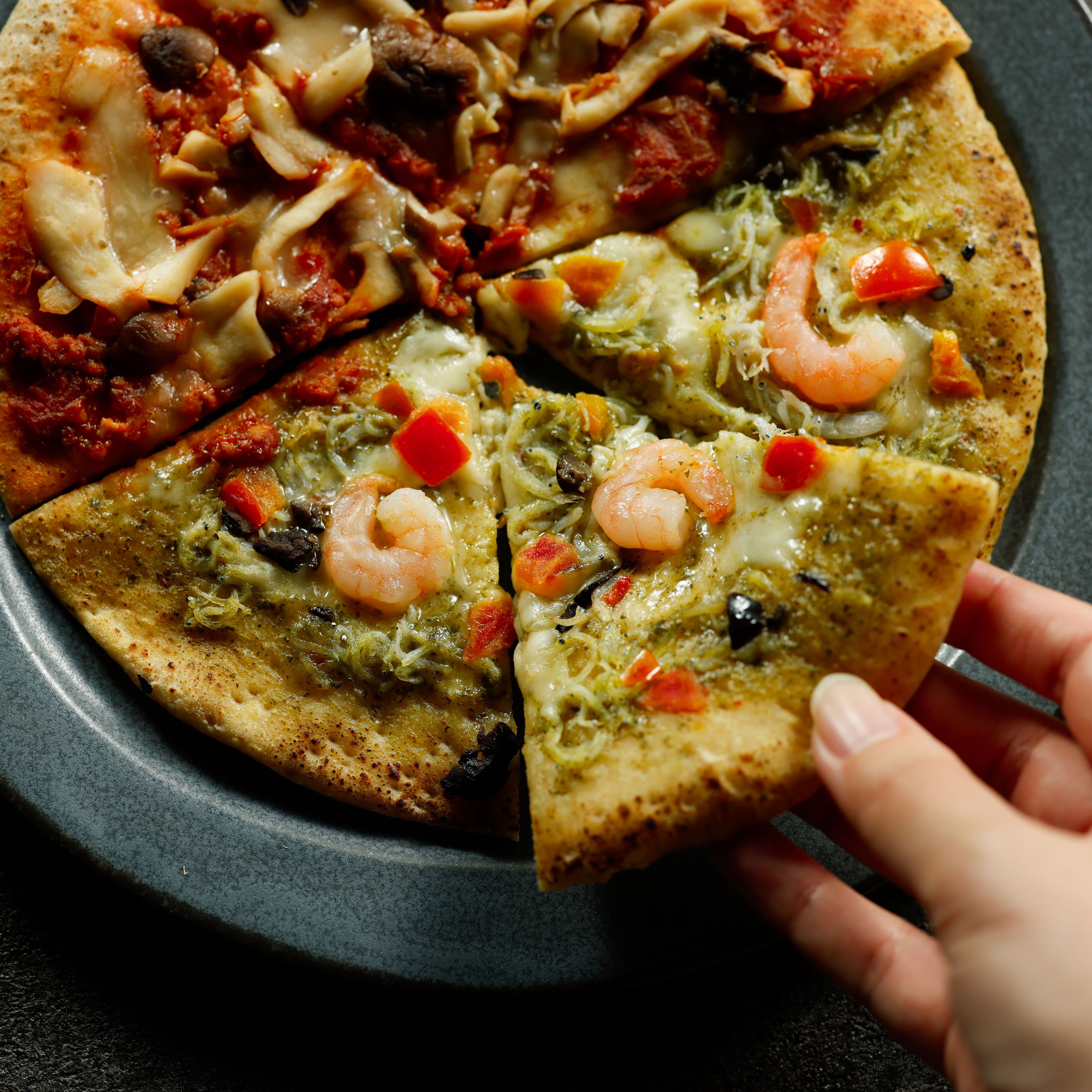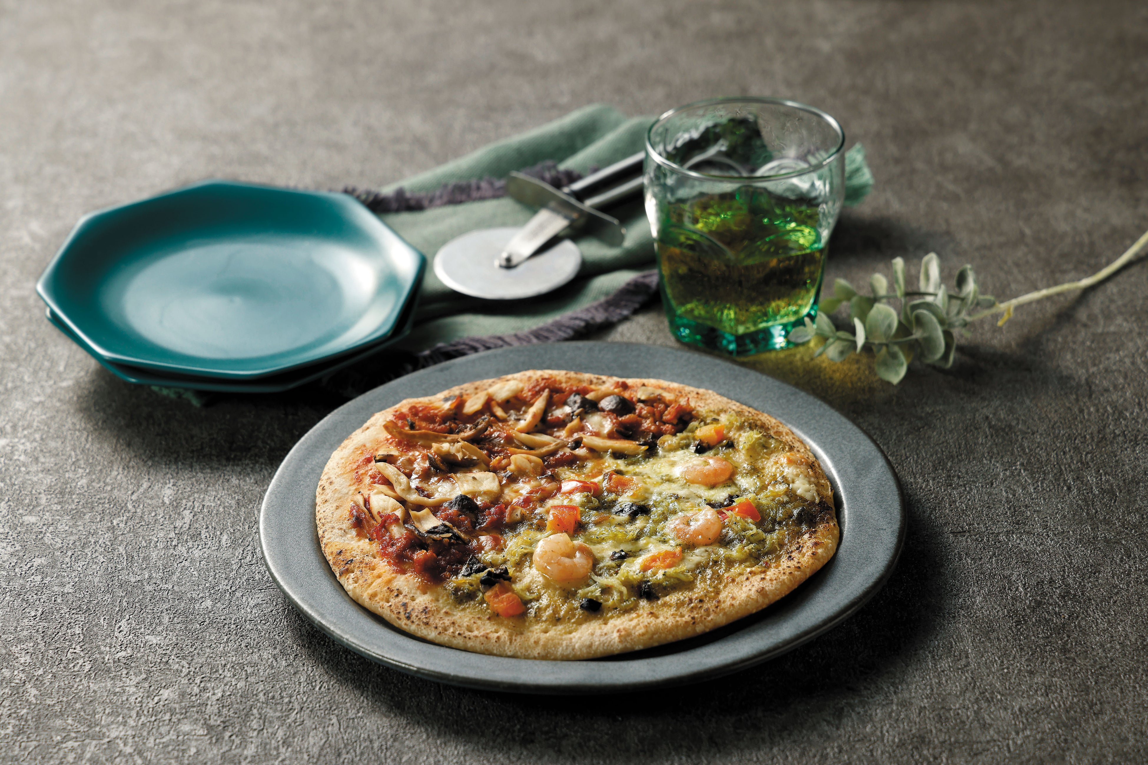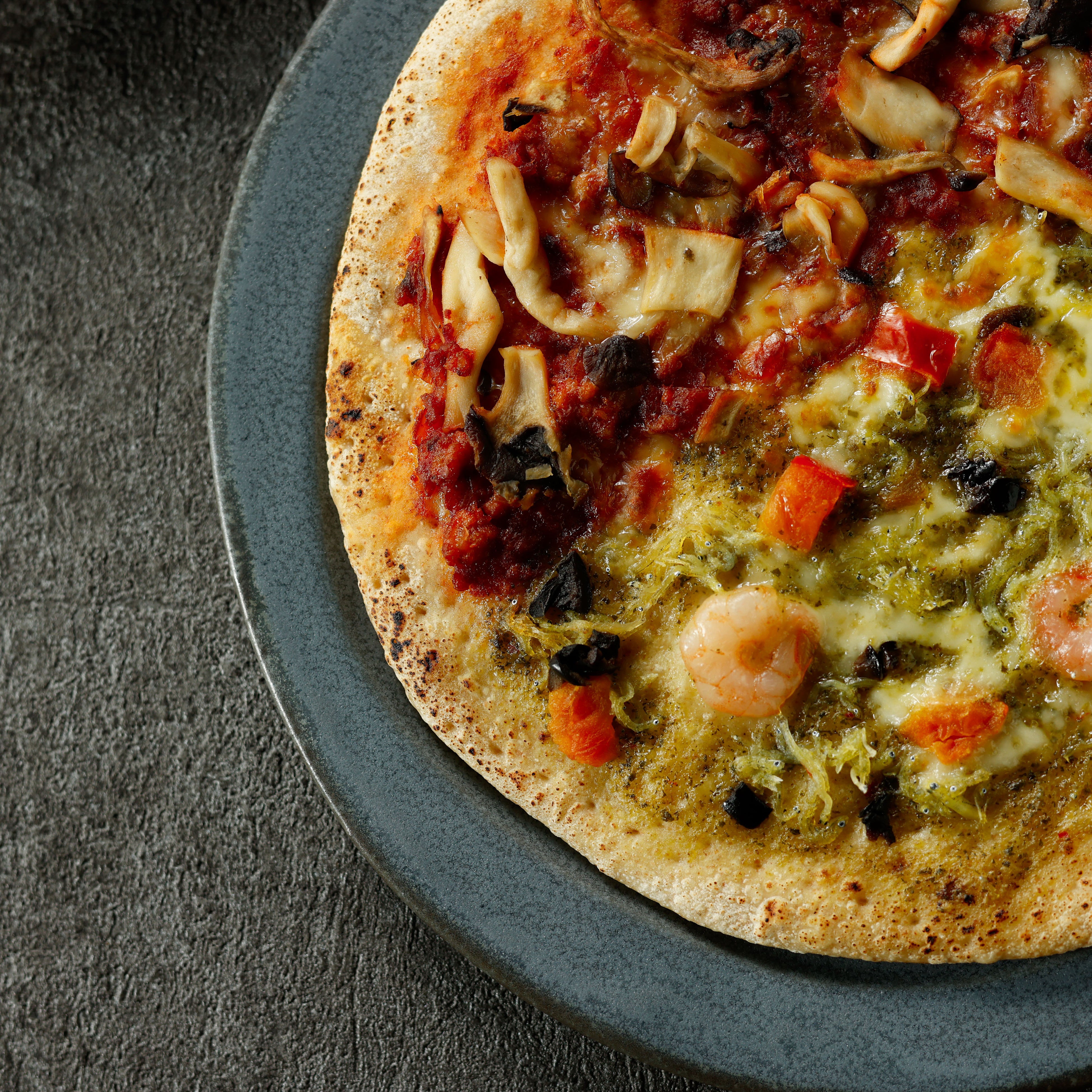 【全粒粉入りピッツァ バジルシーフード&きのこボロネーゼ風】