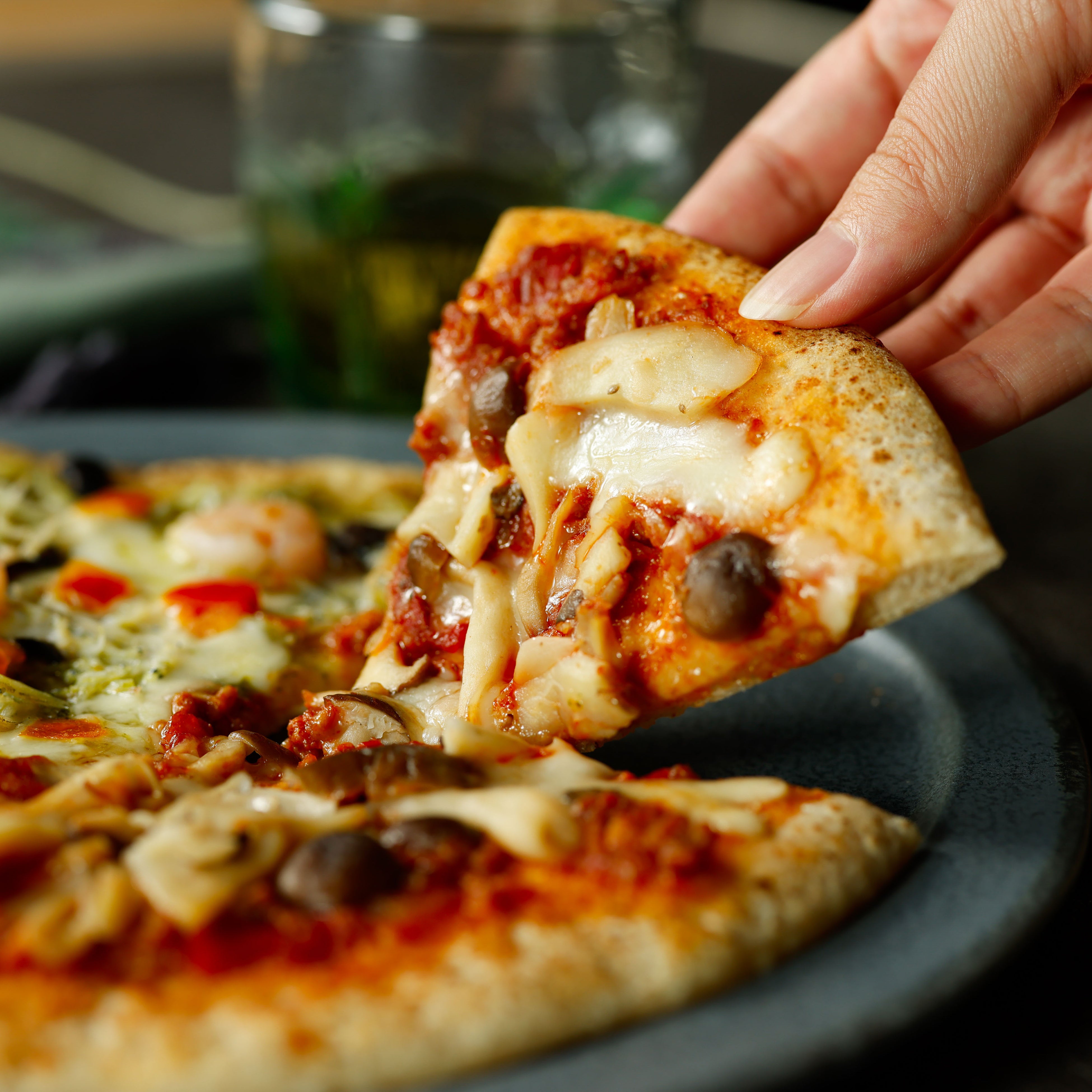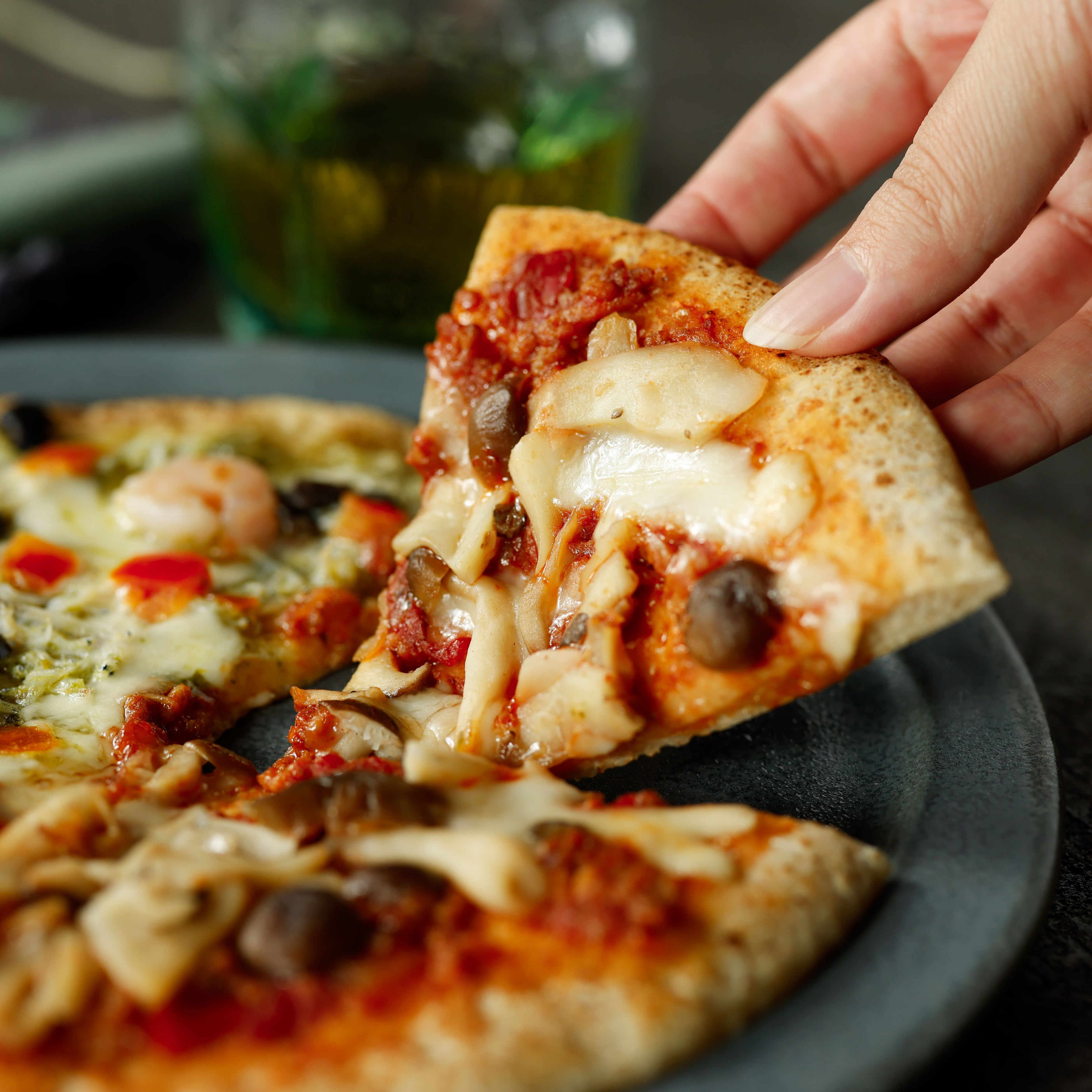 バジルシーフードは、しらすの塩味を引き立たせたピザです。非加熱のトマトをトッピングすることでほのかな酸味が加わり、さっぱりとした後味に仕上がりました。魚介の塩味と旨味、香りが活きた味わいをお楽しみいただけます。