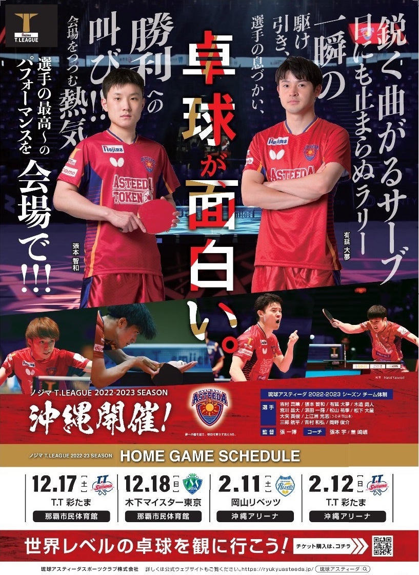 12月17日(土)、18日(日)、那覇市民体育館で開催されるホーム戦では、「チョレイ!」のかけ声でお馴染み先日世界ランク2位の快挙を遂げた張本智和選手のほか、沖縄県うるま市出身の県出身初のTリーガー上江洲光志選手らが出場を予定。王座奪還を目指した白熱した試合と世界トップレベルのプレーに注目です!