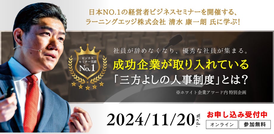 日本No.1のビジネスセミナーを開催するラーニングエッジ社に学ぶ、特別基調講演の開催決定!『成功企業が取り入れている「三方よしの人事制度」とは?』第11回ホワイト企業アワード特別企画