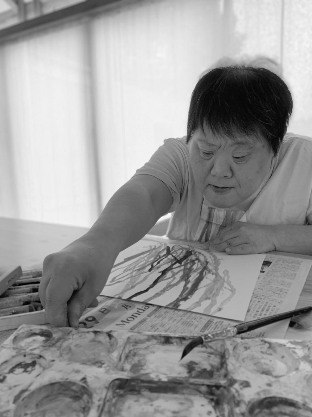 笹山の制作は、スタッフが声を掛けることではじまる。「どうぞ」という一言をきっかけに、彼女は伸びやかに筆を走らせていく。力強い丸や、色とりどりな線。一本一本丁寧に、ぐっと力を込めて、机を覆うように着席した彼女の胸元から外側に向けて線は引かれる。多くの作品は、筆跡が紙からはみ出ており、彼女の力強さとおおらかさが表れている。