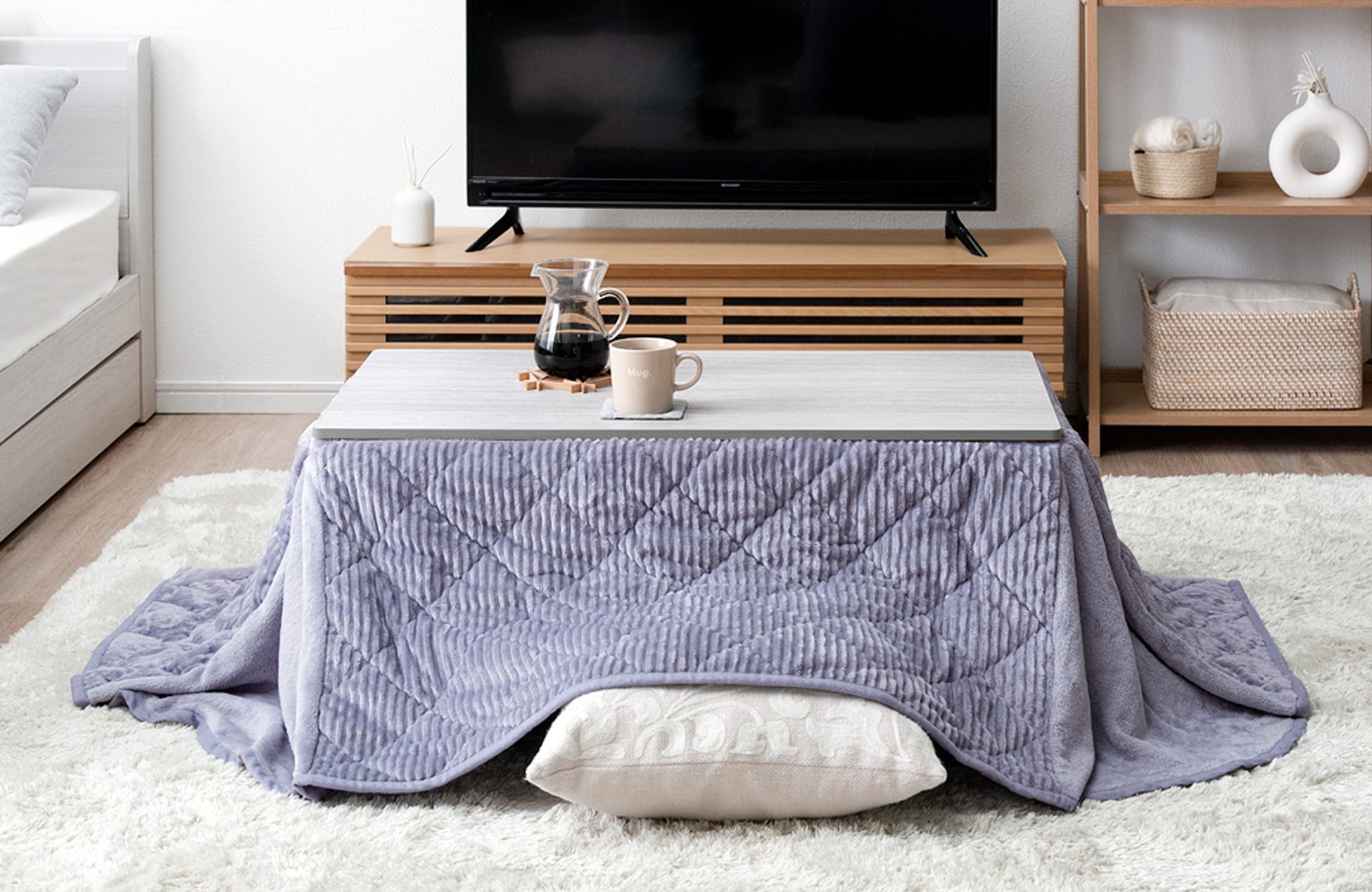 一人暮らしやワンルームのお部屋にすっきり配置できる人気 こたつセット『アルピ』コンパクトサイズの天板とコーデュロイ生地のカジュアルこたつでスマートな冬支度を