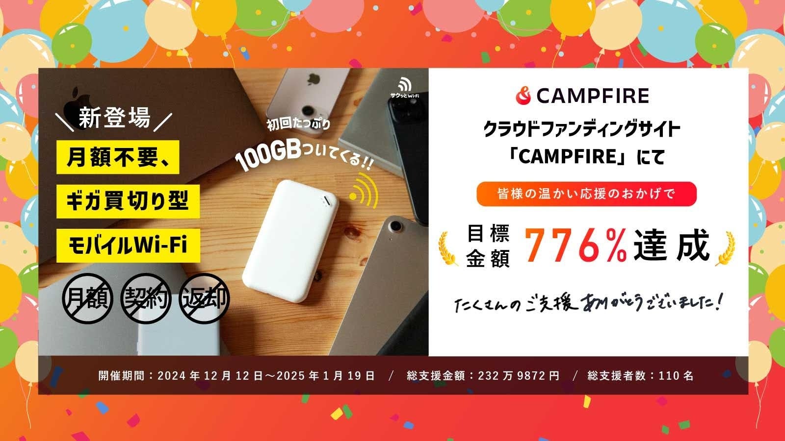 株式会社ACROVE(本社:東京都千代田区、代表取締役社長:荒井 俊亮)は、クラウドファンディングサイト「CAMPFIRE」にて2024年12月12日(木)から2025年1月19日(日)の間、月額不要の買い切り型プリペイド式チャージWi-Fi「サクッとWi-Fi」の先行販売を実施いたしました。約1か月間実施した本プロジェクトは、おかげさまで110名の支援者様から総額約233万円のご支援いただき、目標金額を776%達成できました。この度、プロジェクトに参加くださり、ご支援くださった多くの皆様へ心より感謝を申し上げます。