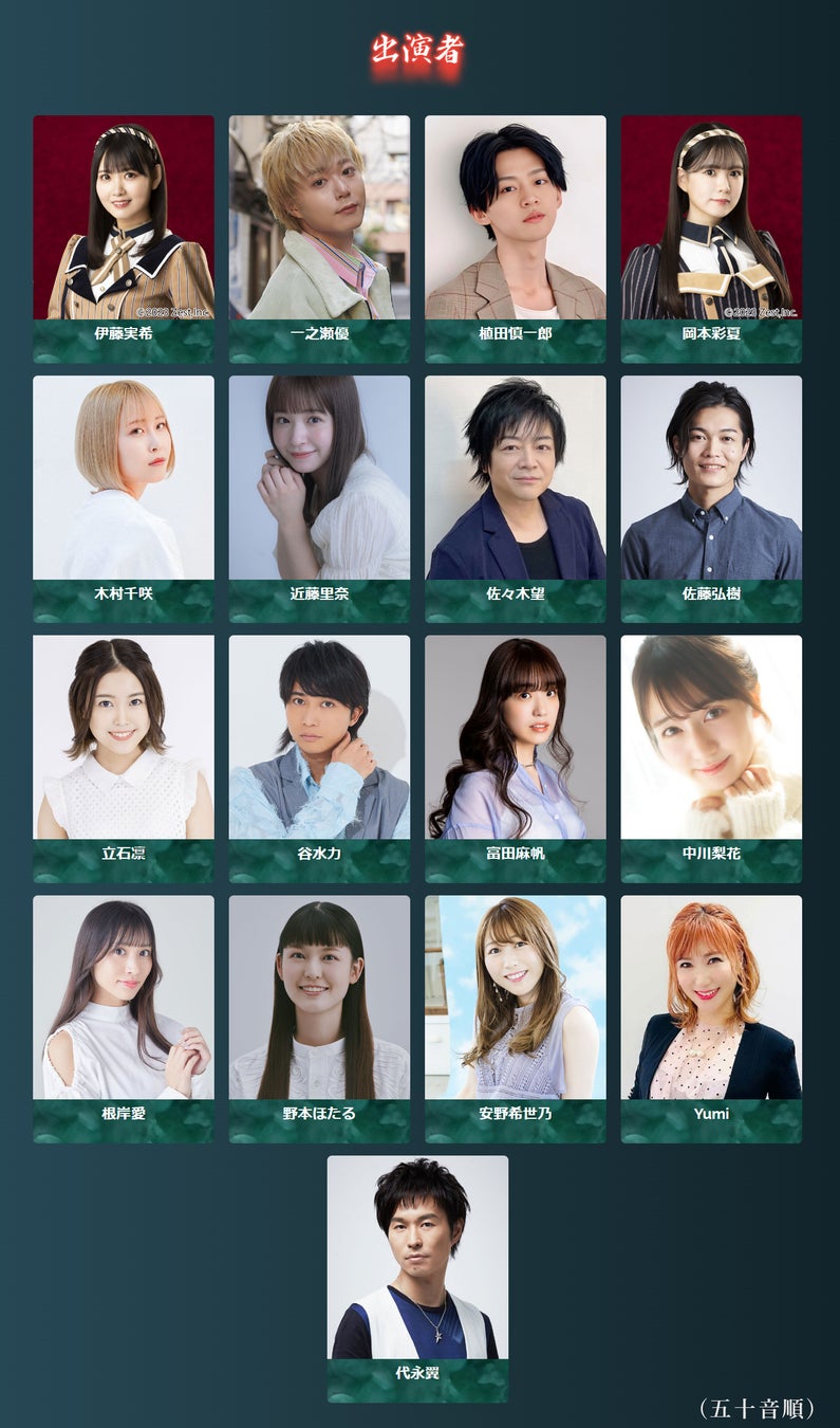 出演は、【8月9日】は、SKE48 Team KⅡ所属で今回が初舞台となる伊藤実希、 同じくSKE48 Team KⅡで、ユニット「プリマステラ」としても精力的に活動中の岡本彩夏、OVA『変幻退魔夜行 カルラ舞う!』、『幽☆遊☆白書』、『AKIRA』などで声優やナレーターとして活躍の佐々木望、ジュノン・スーパーボーイコンテストファイナリストで舞台『弱虫ペダル』などに出演の谷水力、韓流エンタメの大人気MCで、占いカウンセラーでもあるフリーアナウンサー のYumi、【8月10日】は、ダンスボーカルユニット「CUBERS」として活動し舞台俳優としても活動する一之瀬優、『蒼穹の王』、『いい人間の教科書2023』などに出演し、演出、プロデュースなども手掛ける佐藤弘樹、ミュージカル「Annie」モリー役でデビューし舞台を中心に声優・歌手としても活動中の富田麻帆、舞台『トワツガイ』、『少女☆歌劇 レヴュースタァライト』などで活躍の野本ほたる、「スター☆トゥインクルプリキュア」、「アイドルマスターシンデレラガールズ」などに出演の安野希世乃。 【8月11日】は、ジュノン・スーパーボーイ・コンテストファイナリスト、アニメ『惡の華』などに出演の植田慎一郎、 NMB48の1期生で現在女優として活動する近藤里奈、アニメ「BanG Dream! It's MyGO!!!!!」などの声優として活躍する立石凛、舞台《アサルトリリィ》シリーズなどに出演し、TVアニメ『菜なれ花なれ』で声優初主演を務める中川梨花、元ガールズロックユニット『PASSPO☆』のキャプテンで現在は女優として幅広く活躍する根岸愛。【8月12日】は、『音楽ユニット【群咲】としても活躍中で、『ウマ娘』にも出演する木村千咲、2008年第2回声優アワード新人男優賞受賞するなど声優として数多くの作品に出演している代永翼。