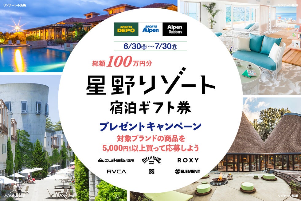 6月30日(金)から7月30日(日)のキャンペーン期間中に、全国のスポーツデポ・アルペン・アルペンアウトドアーズとアルペングループオンラインストアにて、QUIKSILVER(クイックシルバー)・BILLABONG(ビラボン)・ROXY(ロキシー)・RVCA(ルーカ)・DC(ディーシー)・ELEMENT(エレメント)の対象ブランド商品を、1会計で税込5,000円以上ご購入の上、応募していただいた方の中から、“総額100万円分”の星野リゾート宿泊ギフト券、1等10万円分を5名様、2等5万円分を10名様へプレゼントいたします。是非この機会を海の日や夏休み前の海やプールのご準備へご活用ください。