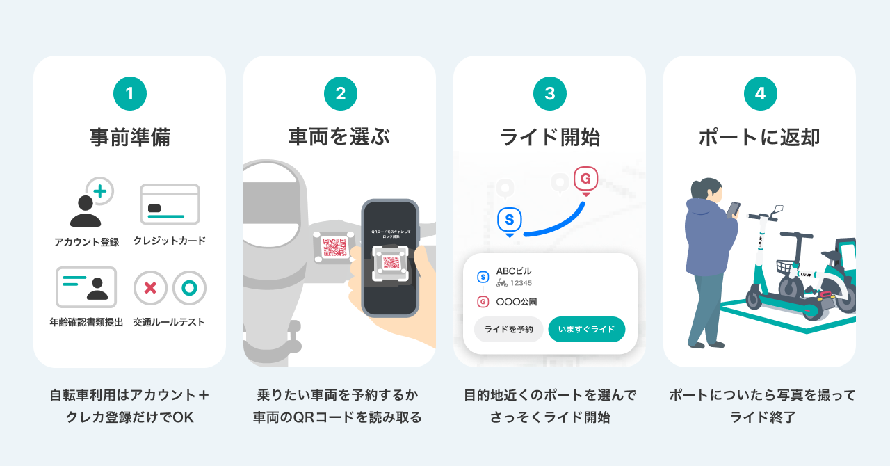 現在、LUUPでは電動キックボードと電動アシスト自転車を取り扱っており、各エリアで通勤や通学、買い物やお出かけ、さらには観光など、様々な用途で日々の移動手段としてご利用いただいています。