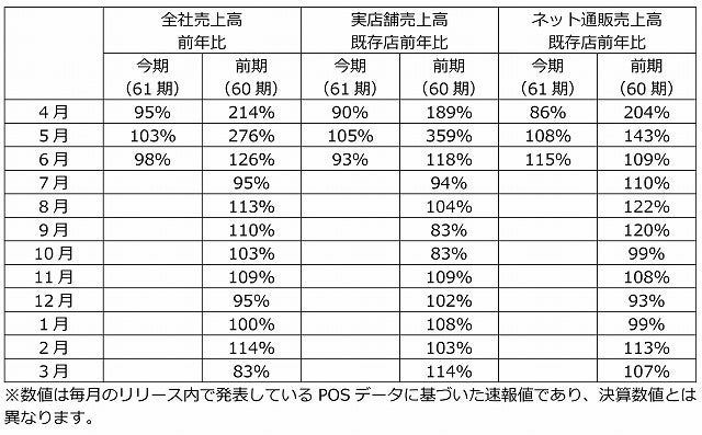 GINZALoveLoveは、アプリ会員を中心に1to1プッシュ通知や顧客へのデータマーケティングの展開を行ってまいりました。6月度は、集客が増えており購入客数は前年を超える水準となりましたが、旅行や行楽への需要が高く、客単価が伸び悩むこととなりました。この結果、実店舗の既存店前年比93%という実績となり、全社の前年比が98%という結果になりました。
