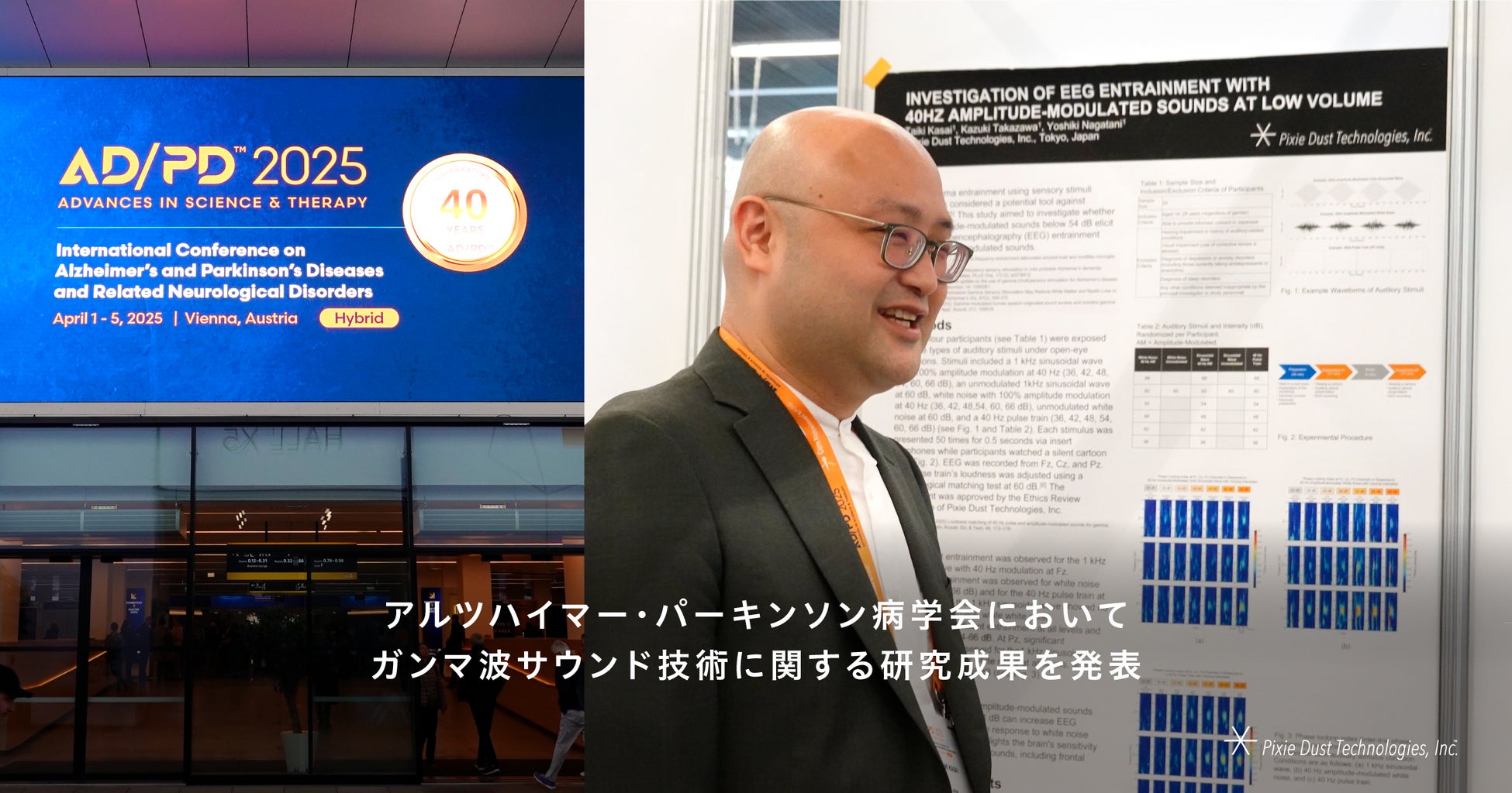 ダイバーシティ&ヘルスケア領域での研究開発と事業化に取り組むピクシーダストテクノロジーズ株式会社(本社:東京都中央区、代表取締役会長CEO:落合 陽一、代表取締役社長COO:村上 泰一郎、以下「PxDT」)は、日常生活を送りながら認知機能ケアできる可能性のある音、「ガンマ波サウンド™」に関する研究結果を2025年4月1日〜5日にオーストリア・ウィーンで開催された「AD/PD™ 2025 International Conference on Alzheimer’s and Parkinson’s Diseases」において発表しました。本研究は、塩野義製薬株式会社との共同事業の一環として実施しました。