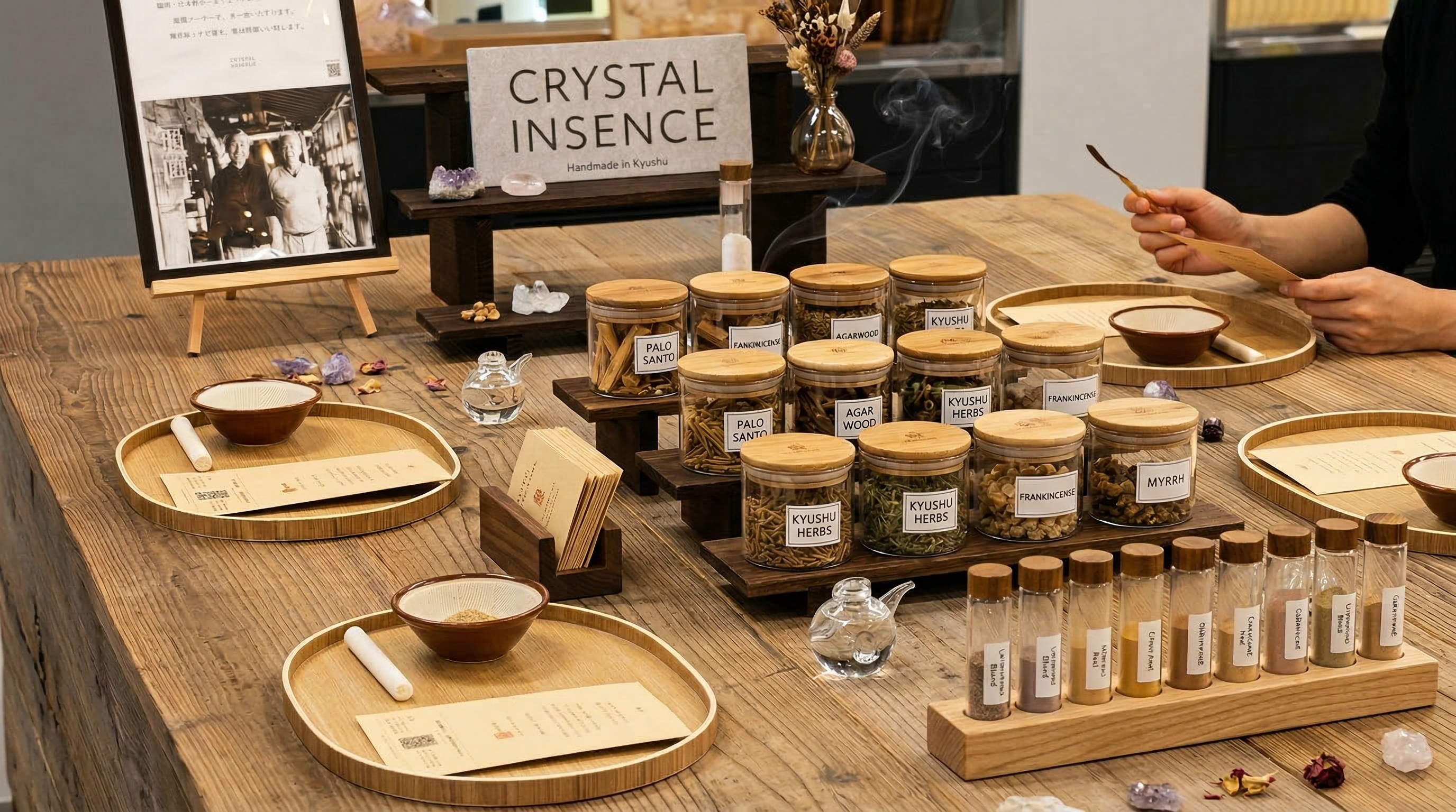 CRYSTAL INSENSEは福岡市内に工房を構え、九州産素材を使った無添加お香を職人が一つひとつ手づくりしているブランドです。「福岡発のものづくりブランド」×「福岡に誕生した新しい交流拠点」── 地元同士のコラボレーションだからこそ実現する、ここでしかできないワークショップです。