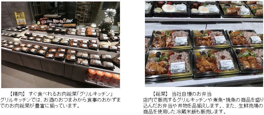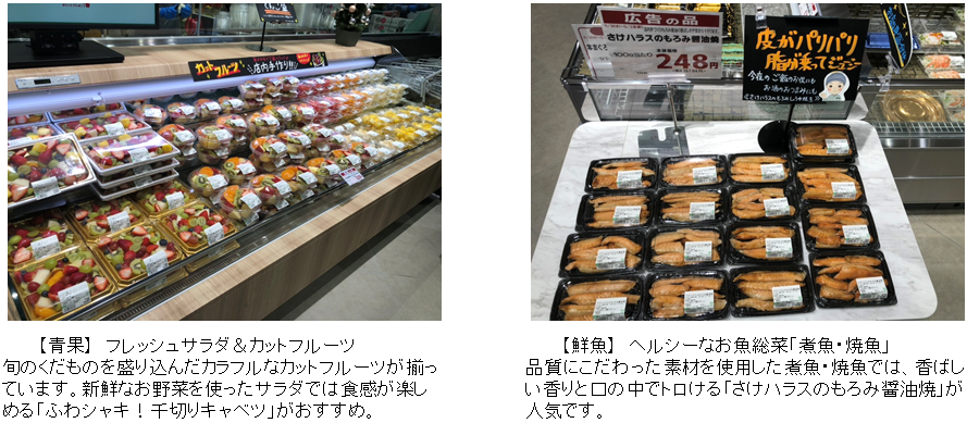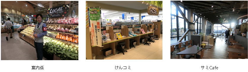 お客様の売場案内をする「案内係」を配置し、食と健康のコミュニティスペース「けんコミ」も設置。イートインスペース「サミCafe」には61席の座席と「キッズスペース」を設置します。その他にも収納代行サービスやATM、買上品配達サービス(12月7日開始)を行って、地域のお客様に寄り添ったサービスを提供いたします。
